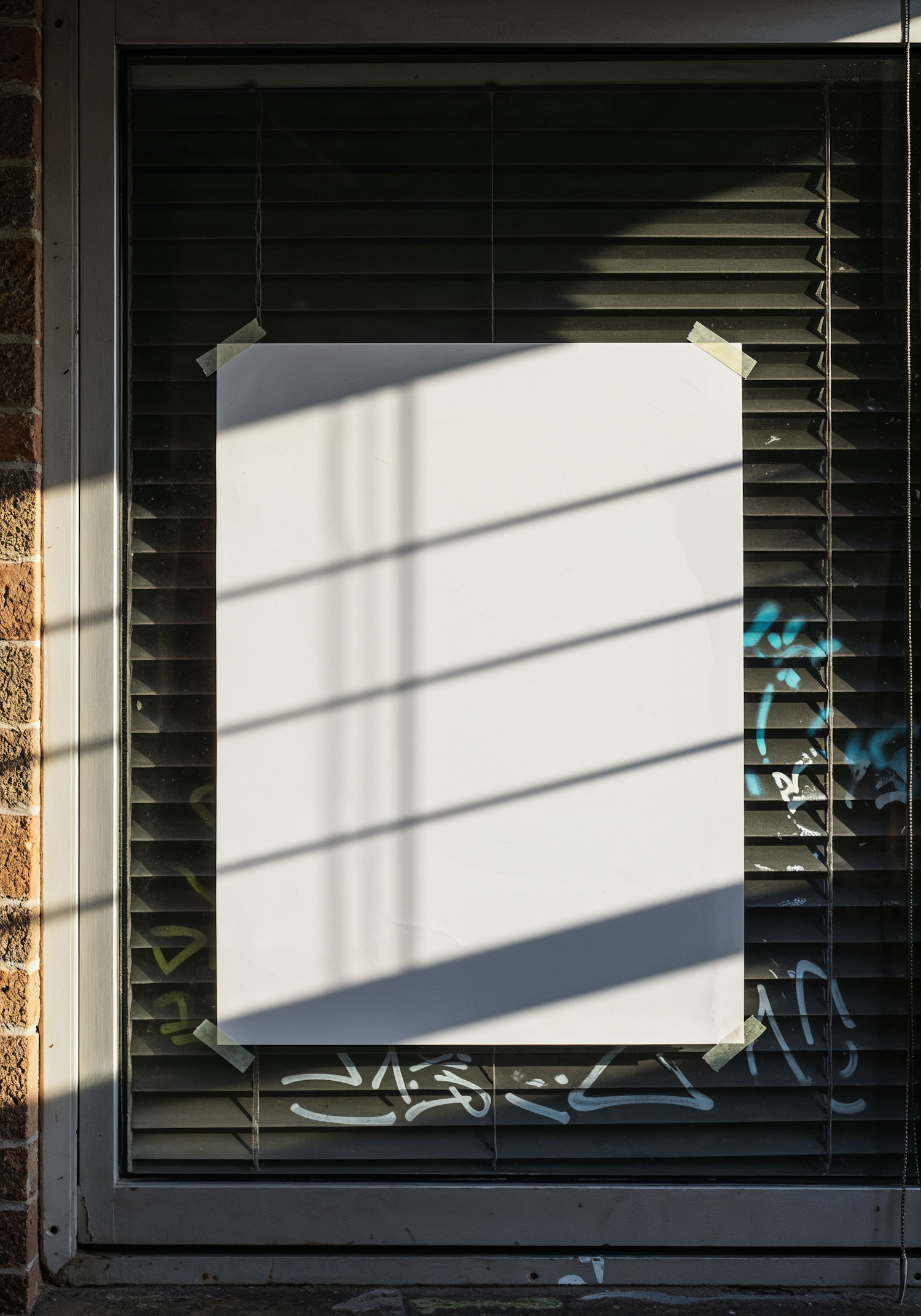 Blank white poster taped to a window with black blinds, graffiti on the lower blinds, and diagonal shadows in warm sunlight.