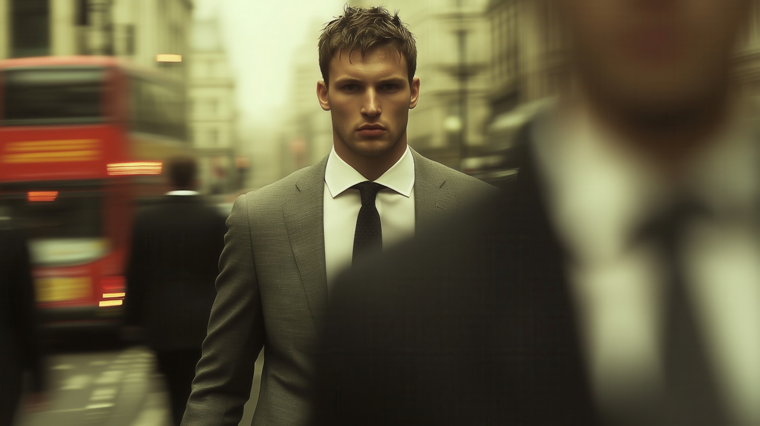 Sharp-dressed man in a gray suit stands out in a busy city street with a red double-decker bus in the background.