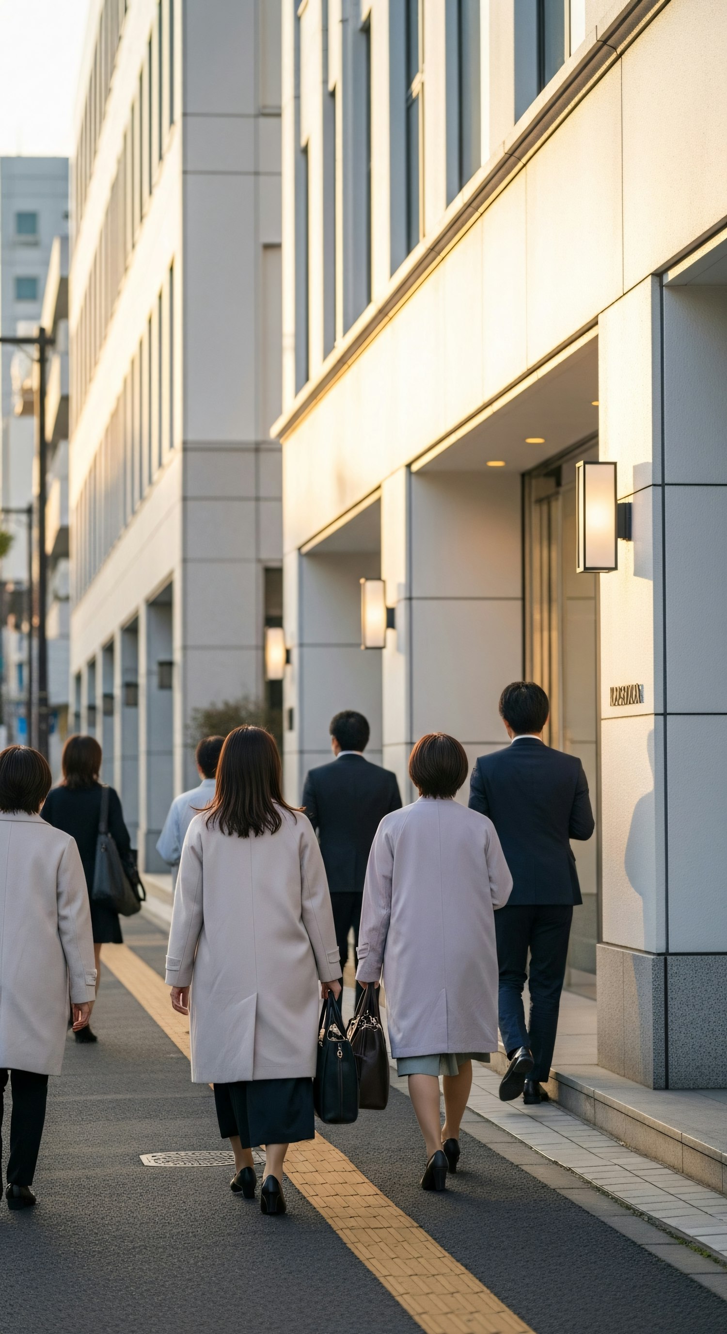 Professionals walking along a city sidewalk near a modern office building during golden hour, showcasing urban life and business attire.