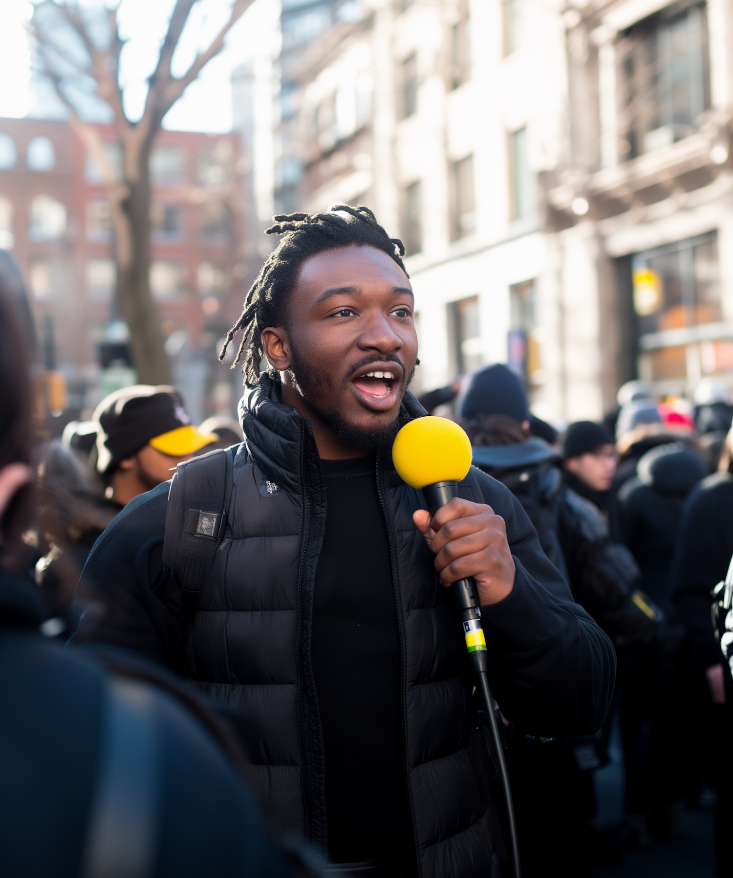 A man with a yellow microphone speaks passionately in a crowd during an outdoor event in an urban setting.