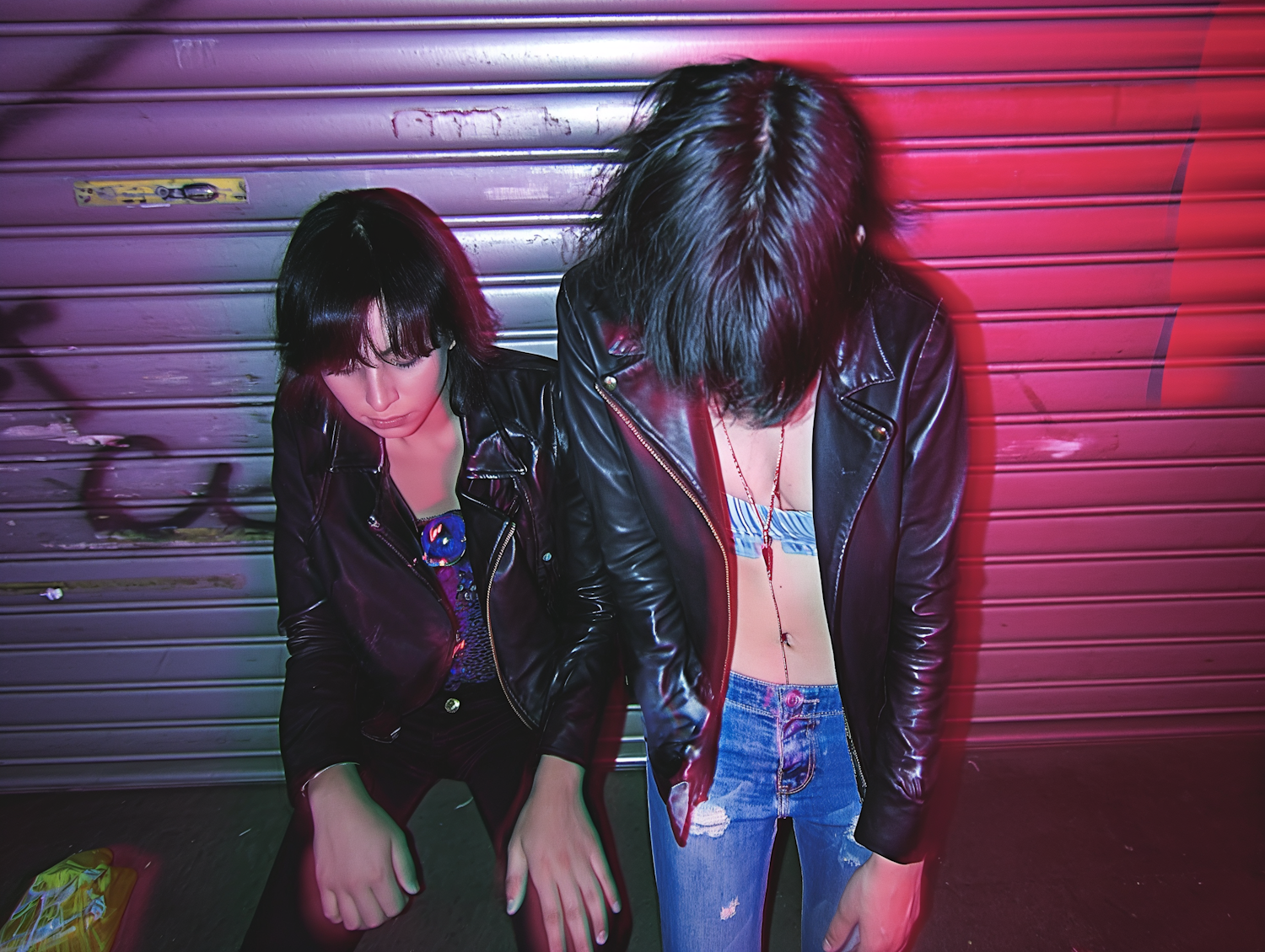 Two individuals in leather jackets under vibrant pink lighting against a graffiti-covered shutter, creating an edgy urban vibe.