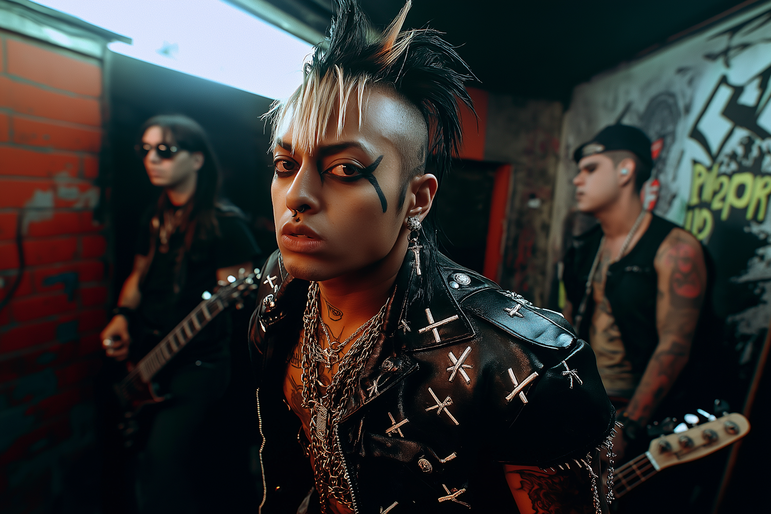 Punk rock band members with edgy style and mohawk in a gritty, graffiti-filled setting, exuding rebellious energy.