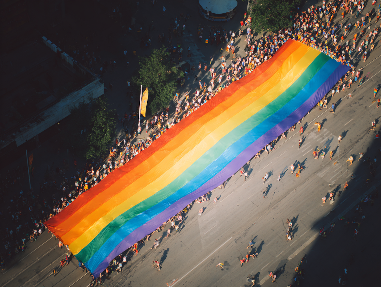 A vibrant rainbow flag being carried down a city street by a joyful crowd, celebrating unity, diversity, and community spirit.
