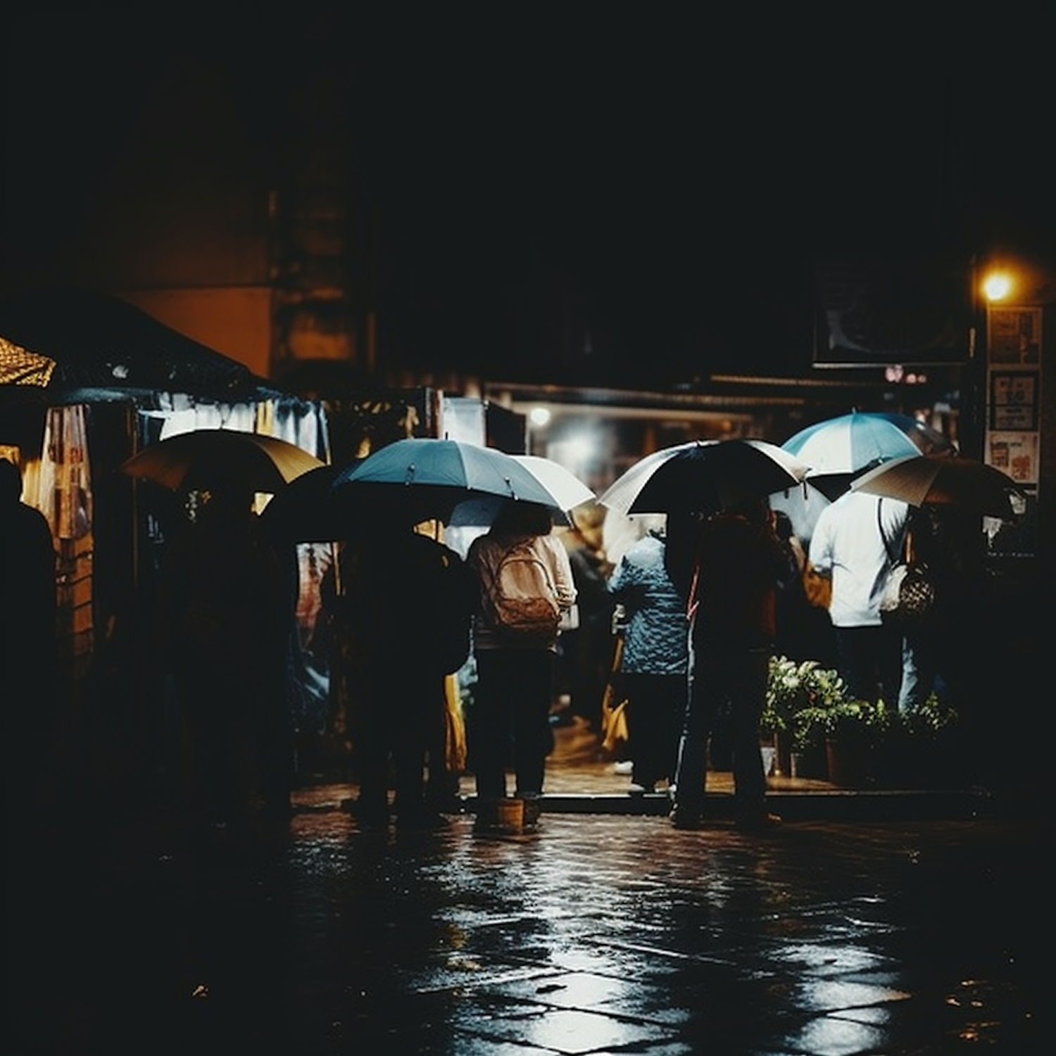 People with umbrellas gather on a rainy night, illuminated by streetlights, creating a moody urban scene with reflections on wet pavement.
