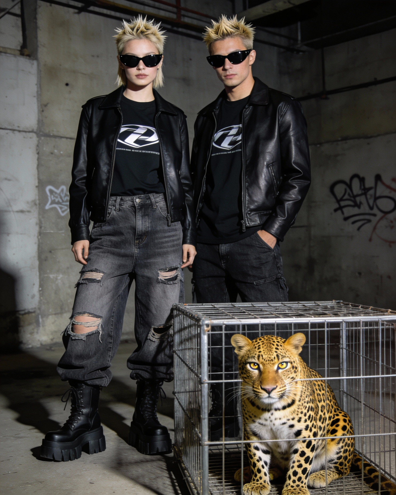 A man and a woman fashion model both with short, spiked blonde hair and wearing sunglasses pose confidently in front of a cage containing a leopard. The individuals are dressed in a black leather jackets , and tshirts with modern design logos, baggy distressed jeans, paired with chunky black boots. The leopard, with its striking golden fur and black spots, gazes directly at the camera, its intense eyes adding a dramatic urban element to the scene.
