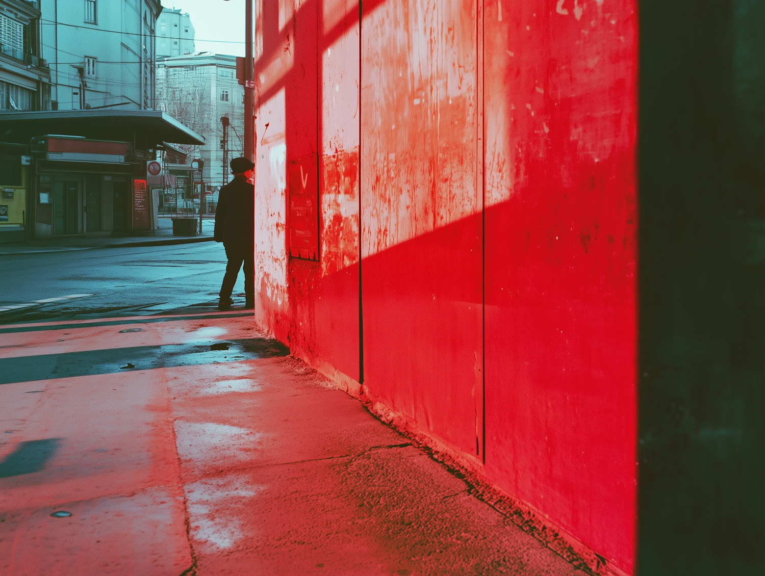 Moody city street with a striking red wall and a lone figure walking away, creating a dramatic urban scene.