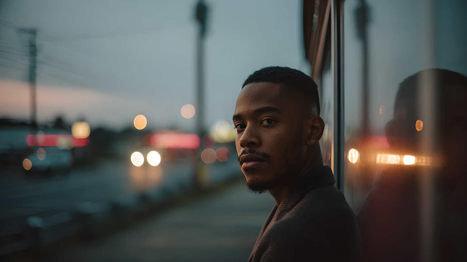 A man leans against a reflective surface at dusk, with blurred city lights in the background creating a serene and contemplative mood.