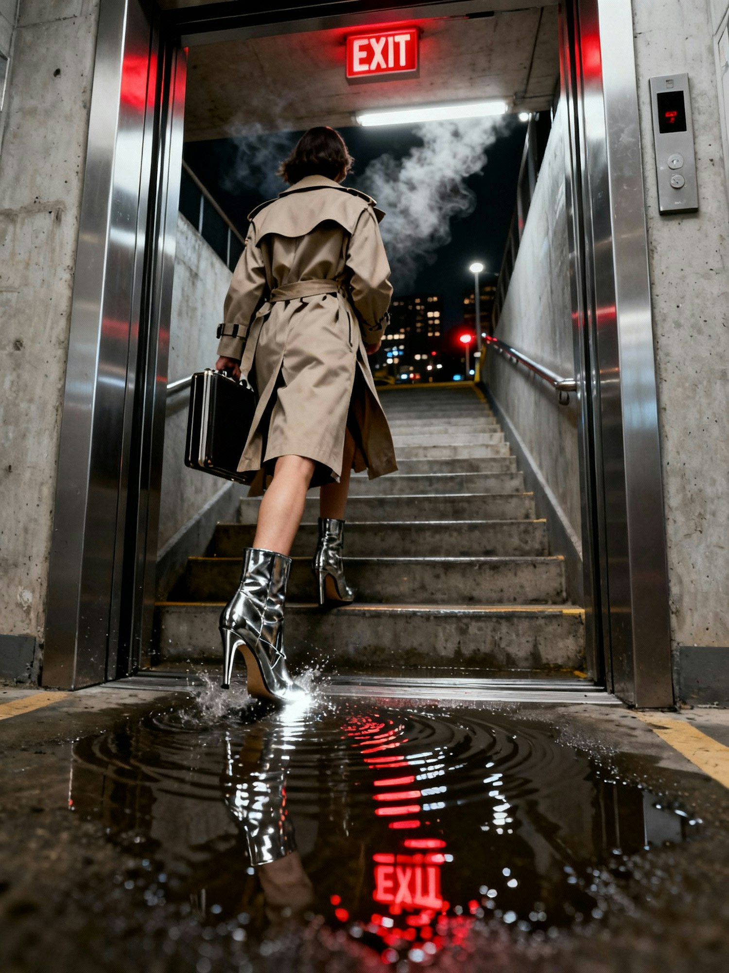 A person in a trench coat and silver boots walks up wet stairs under an 'EXIT' sign, their reflection visible in a puddle below.