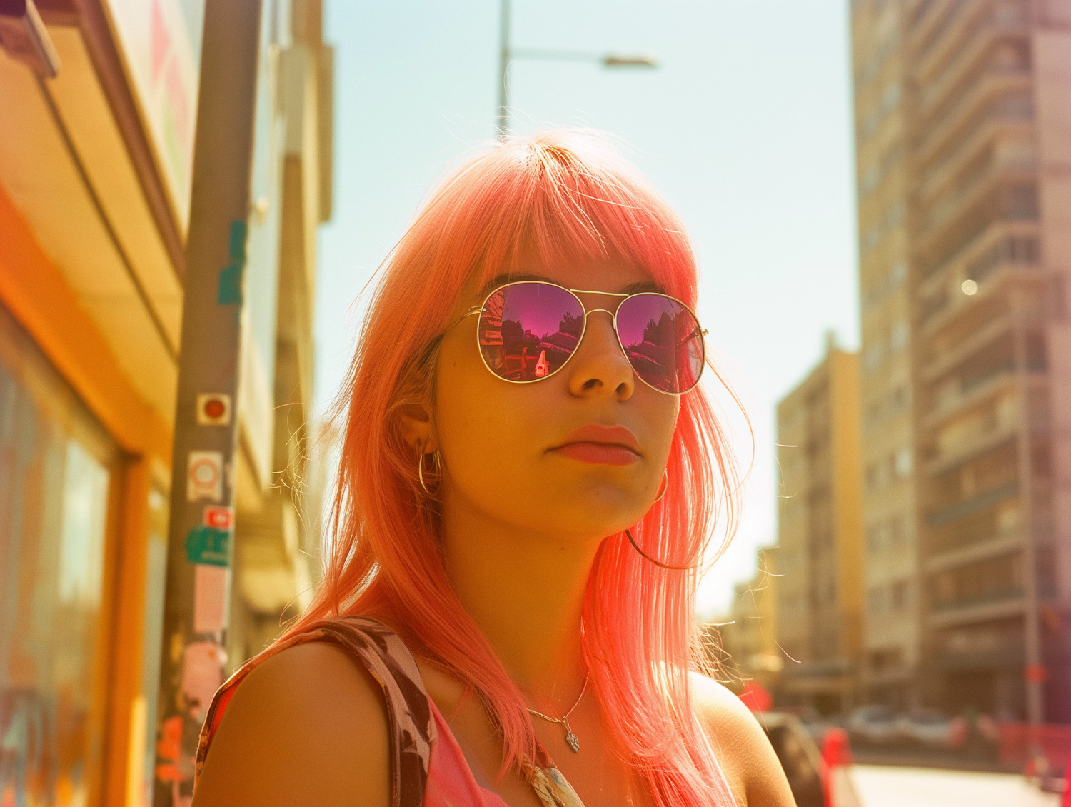 Young woman with pink hair and sunglasses in a sunny urban setting, reflecting cityscape in lenses. Warm, dreamy atmosphere.