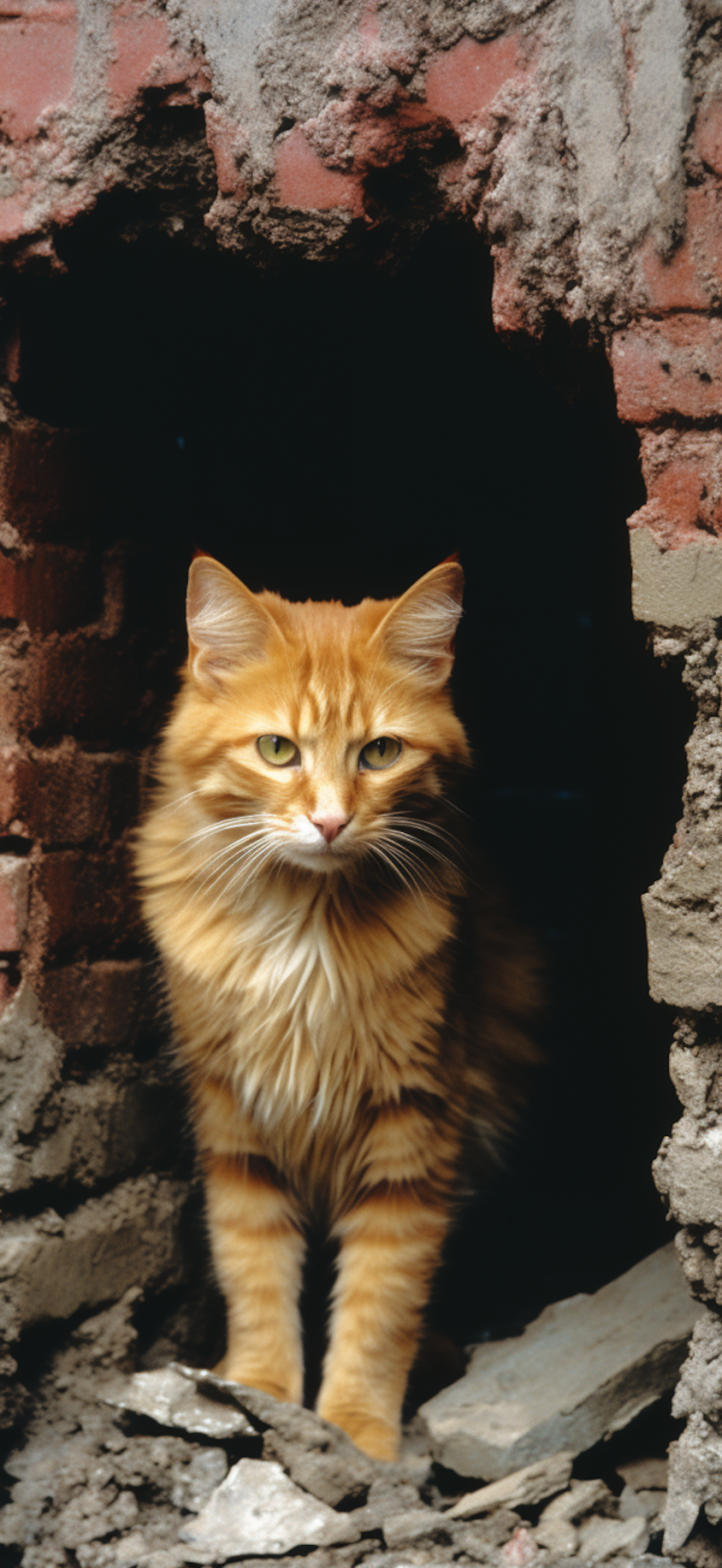 Ginger tabby cat with fluffy fur and yellow-green eyes stands in a crumbling brick wall opening, exuding curiosity and elegance.
