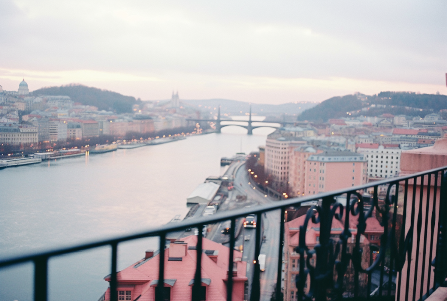 Scenic cityscape at dusk with a river, pastel buildings, and a bridge. Iron railing in foreground adds depth. Serene and calm atmosphere.
