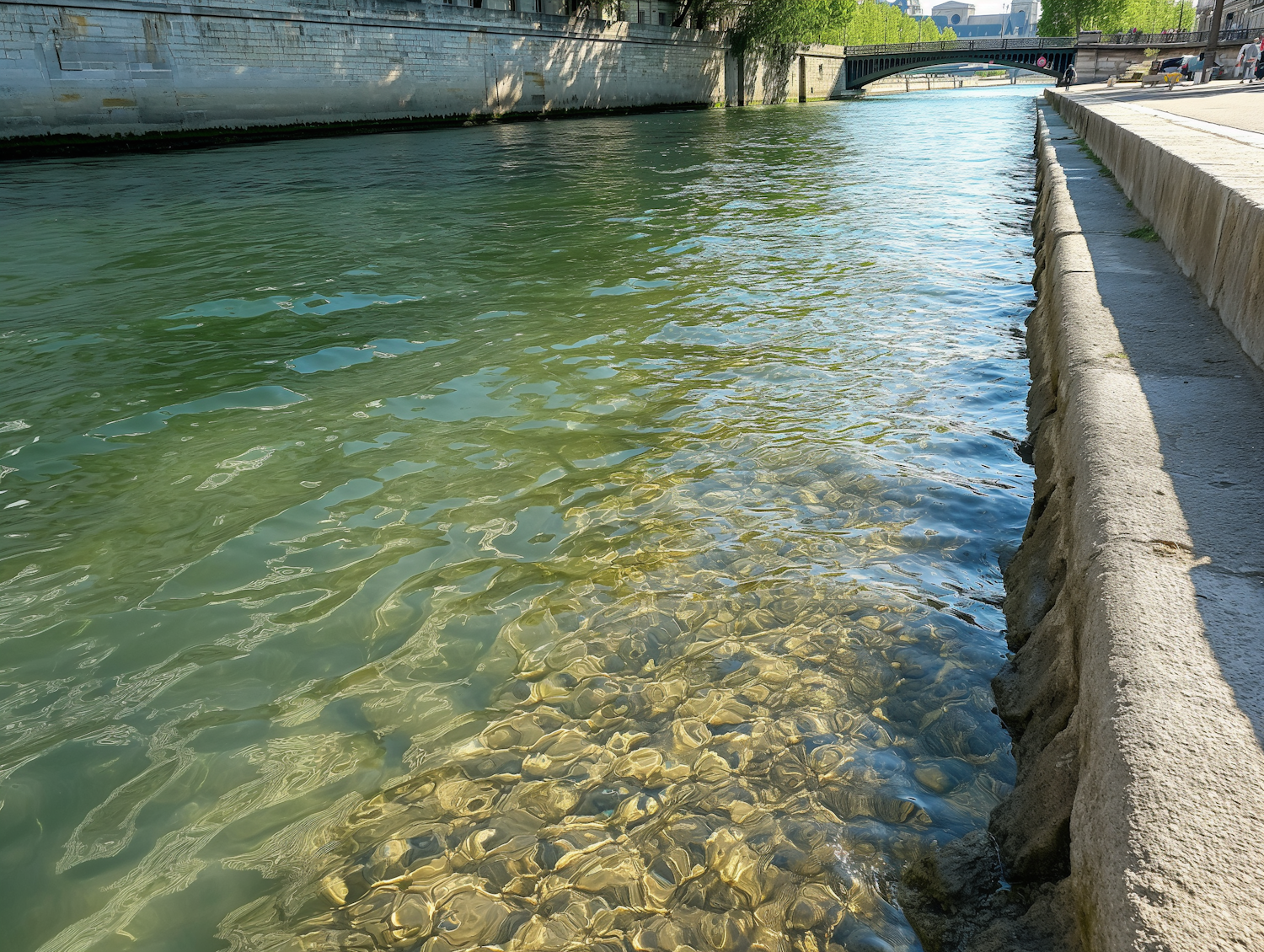 Tranquil riverside with clear water, stone embankment, and distant bridge under a sunny sky. Perfect for a peaceful stroll.