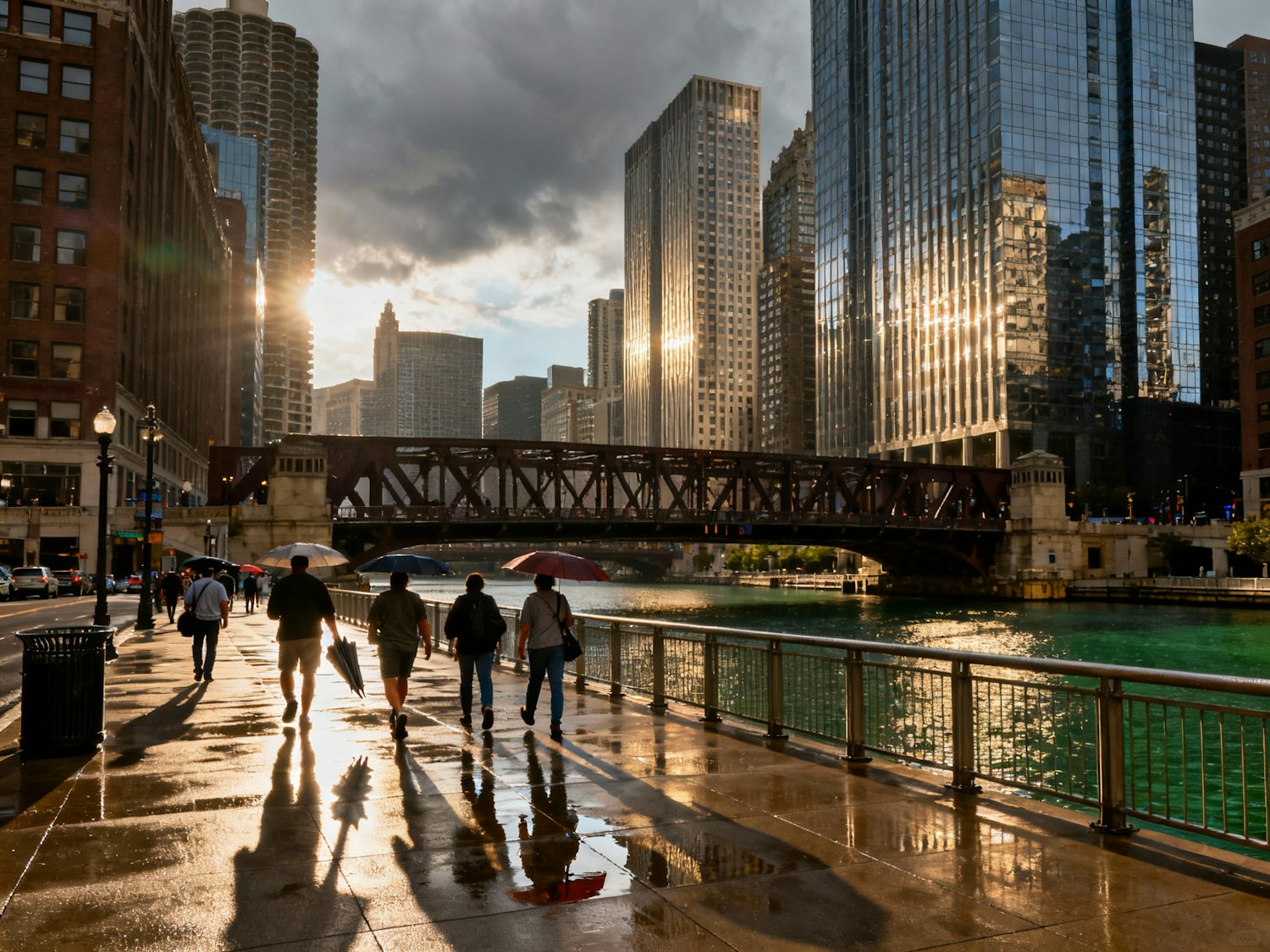 Chicago, USA — Wacker Drive river canyon, post-storm; camera-left raking sun; neutral-warm 5400–5700 K; steel bridges and glass façades ignite; river shows broken, natural reflections (not mirror); pedestrians with folded umbrellas. 24 mm, f/7.1, ISO 100, 1/250 s; CPL for sky and metal/water glare—avoid rainbow banding. Negative: gray haze, halo edges, green water tint, plastic water, HDR look.