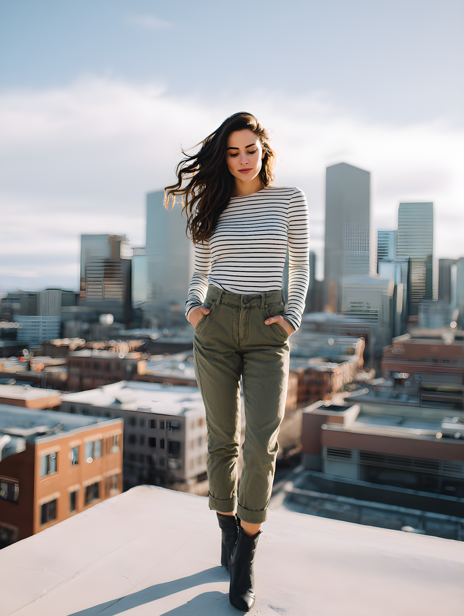 Stylish woman on a rooftop with a city skyline, wearing a striped shirt and olive pants, exuding modern urban vibes.