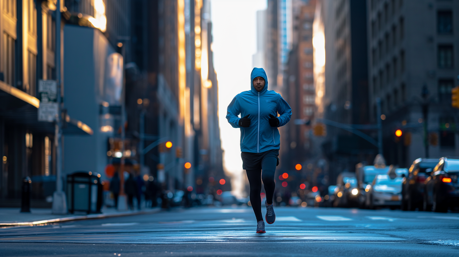 Man jogging in a city street at dawn, wearing a blue hoodie and black pants, with tall buildings and warm morning light in the background.