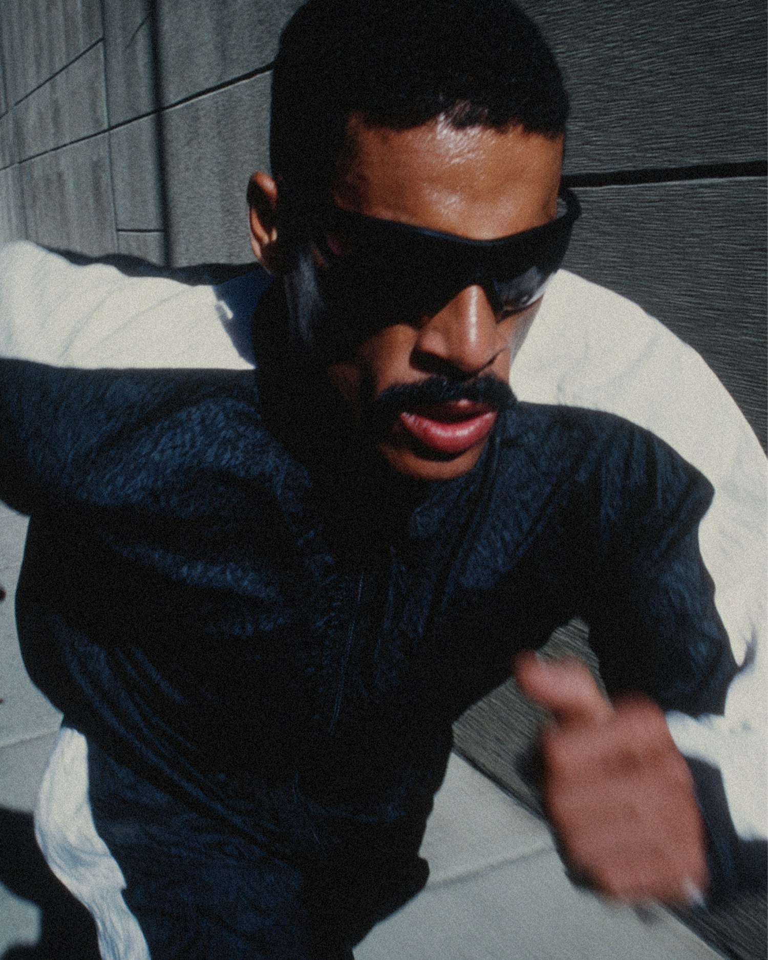 A man in a black tracksuit and sunglasses runs with determination against a concrete urban backdrop, showcasing energy and focus.