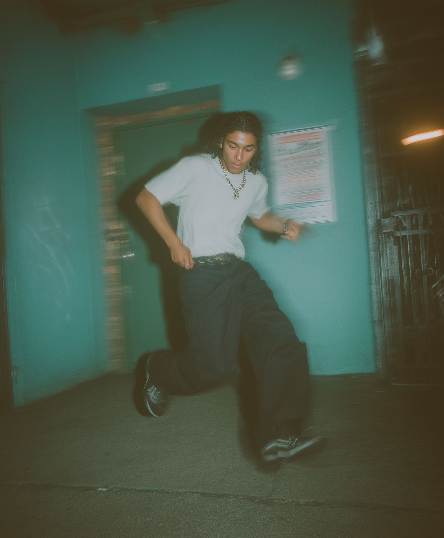 A person in a white t-shirt and black pants runs past a teal wall in an urban setting, captured with dynamic motion blur.