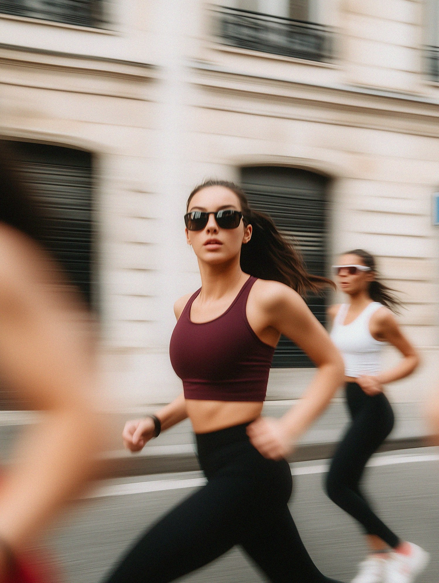 Women running in an urban setting, wearing athletic wear and sunglasses, with a city building in the background.
