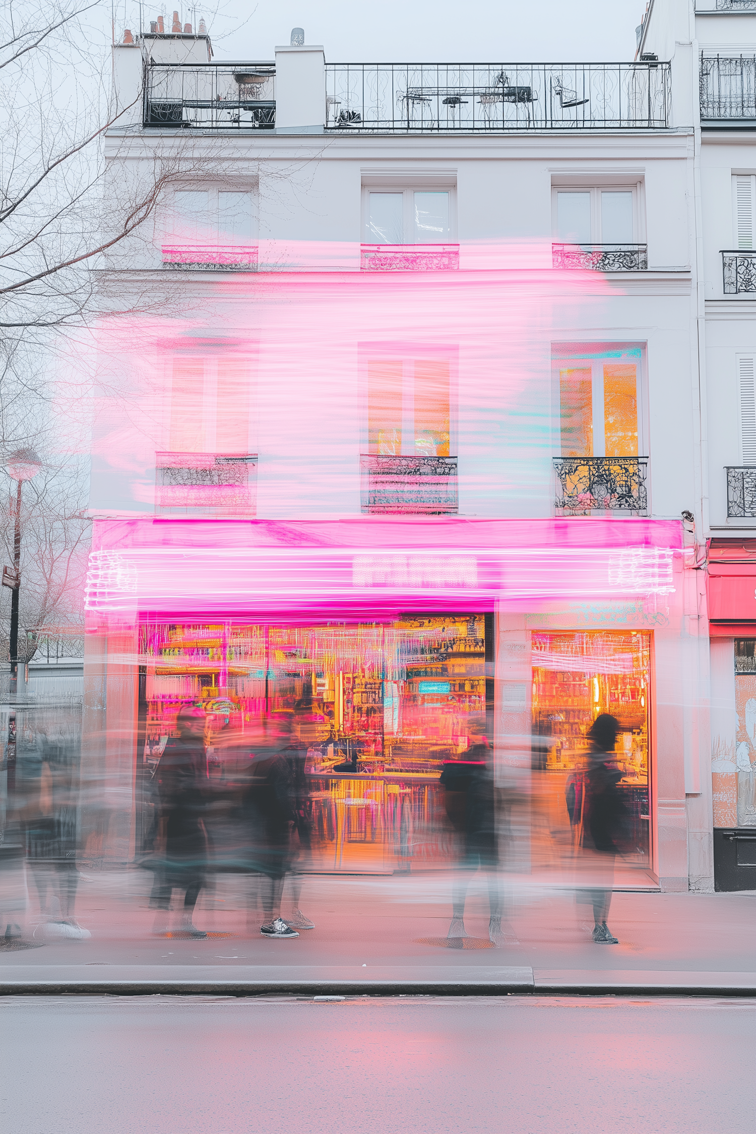 Bright neon-lit storefront with blurred pedestrians in motion, set against a white building with black railings and rooftop terrace.