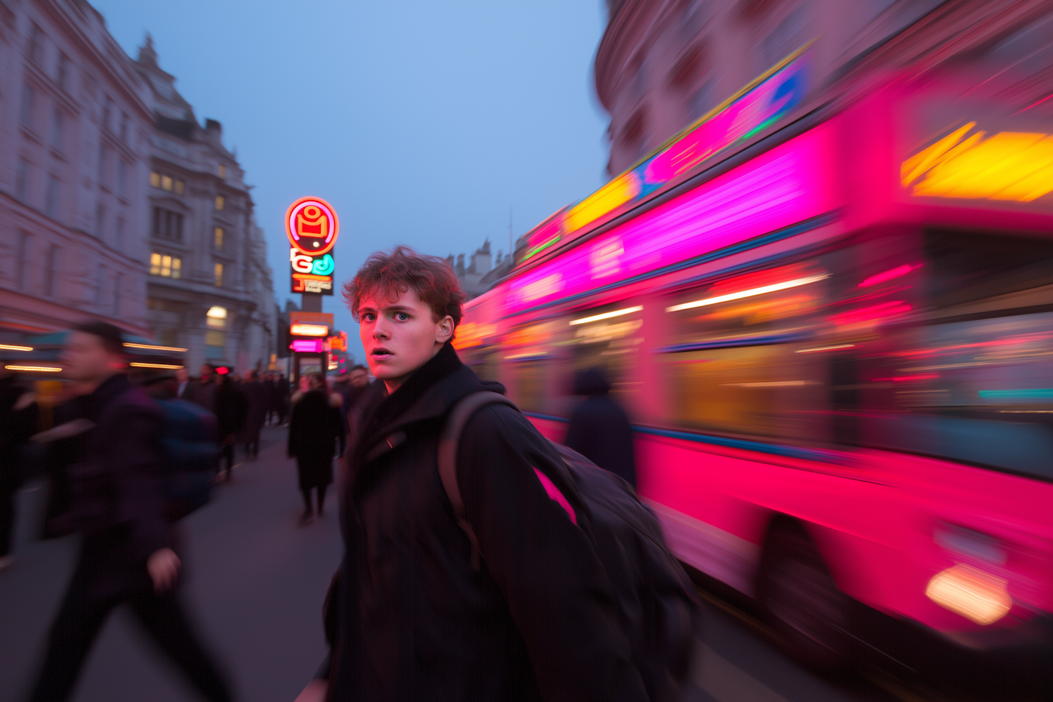 Young man in a bustling city street with vibrant neon lights and a pink bus speeding by, capturing urban energy and motion.
