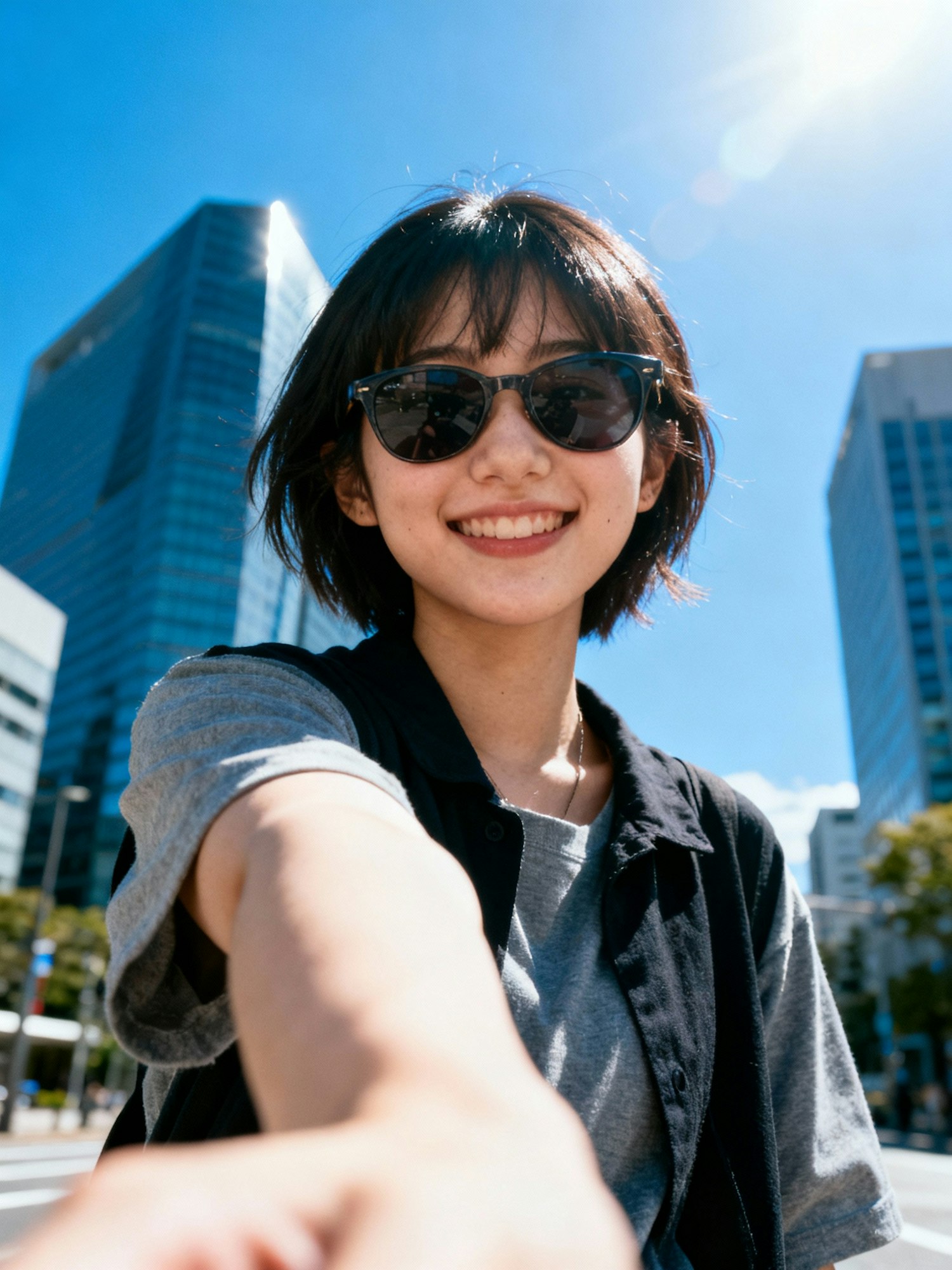 A cheerful young woman takes a selfie in a sunny urban setting, wearing sunglasses and casual attire, with skyscrapers in the background.