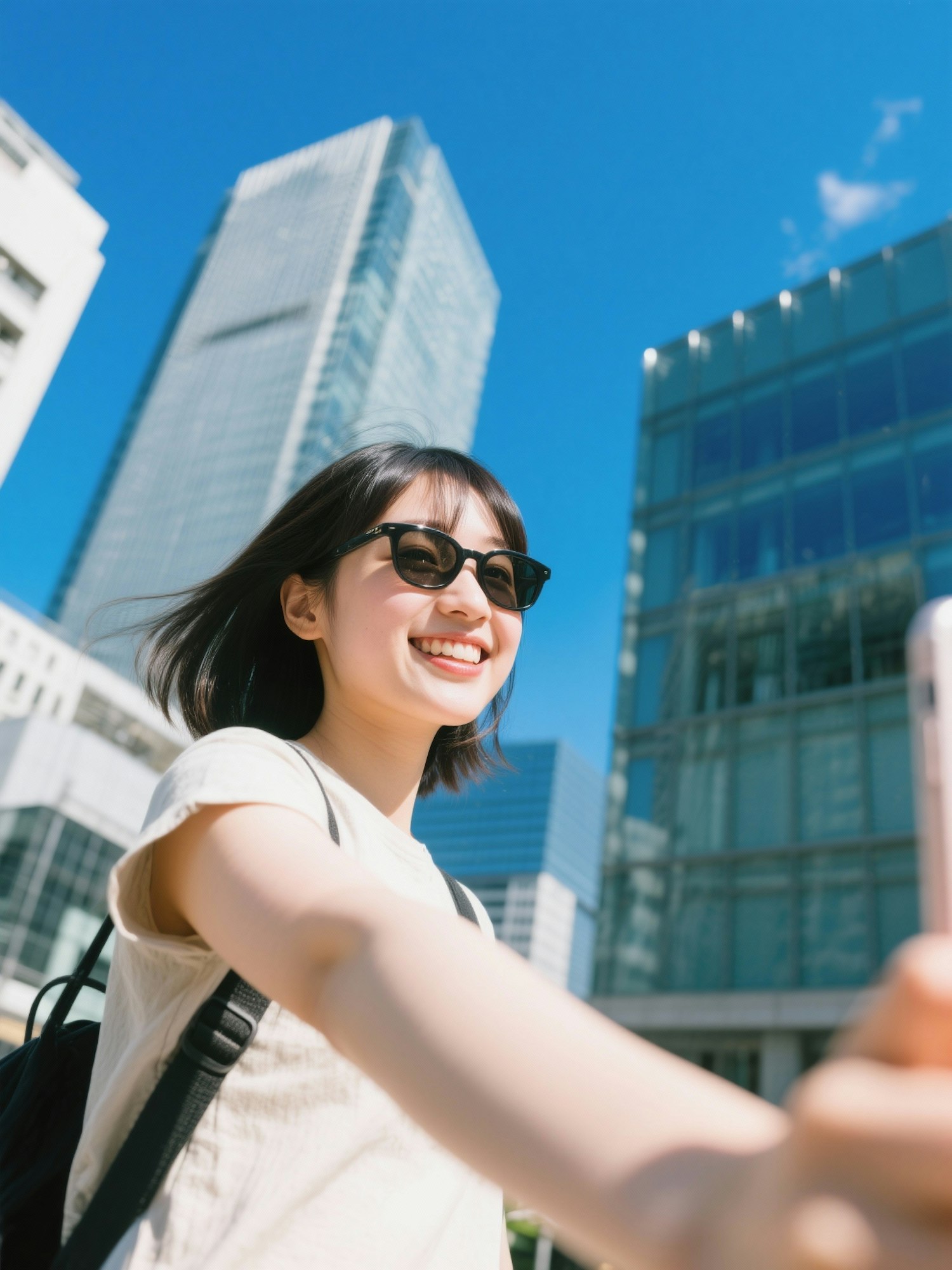A stylish Japanese girl wearing sunglasses takes a selfie under a bright blue sky, with sunlight illuminating her face. In the background, modern urban architecture is visible, creating a vibrant city atmosphere. She has natural Japanese features, casual trendy clothing, and a confident, cheerful expression, captured in crisp, realistic detail with bright, sunny lighting.
