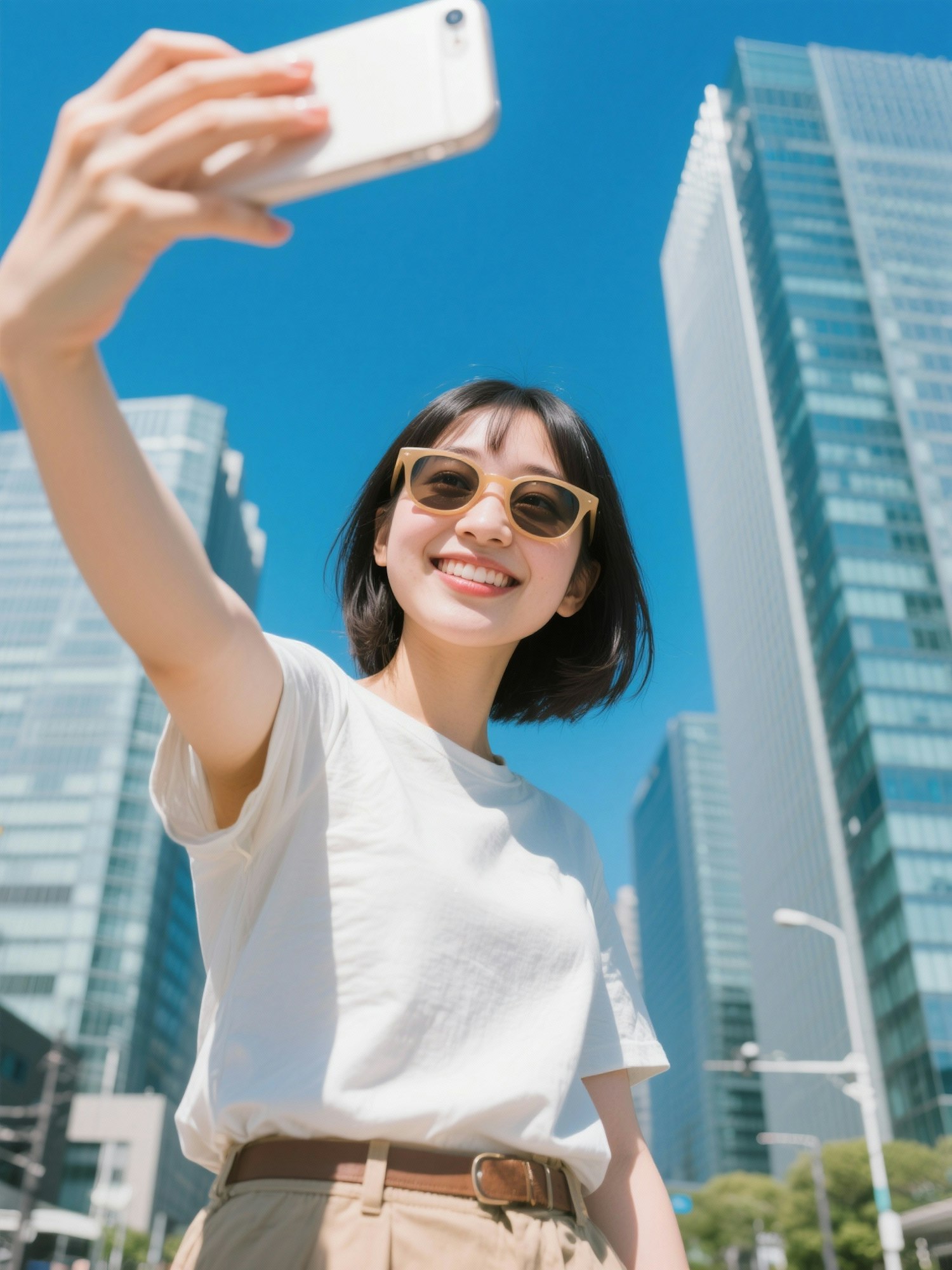 A stylish Japanese girl wearing sunglasses takes a selfie under a bright blue sky, with sunlight illuminating her face. In the background, modern urban architecture is visible, creating a vibrant city atmosphere. She has natural Japanese features, casual trendy clothing, and a confident, cheerful expression, captured in crisp, realistic detail with bright, sunny lighting.
