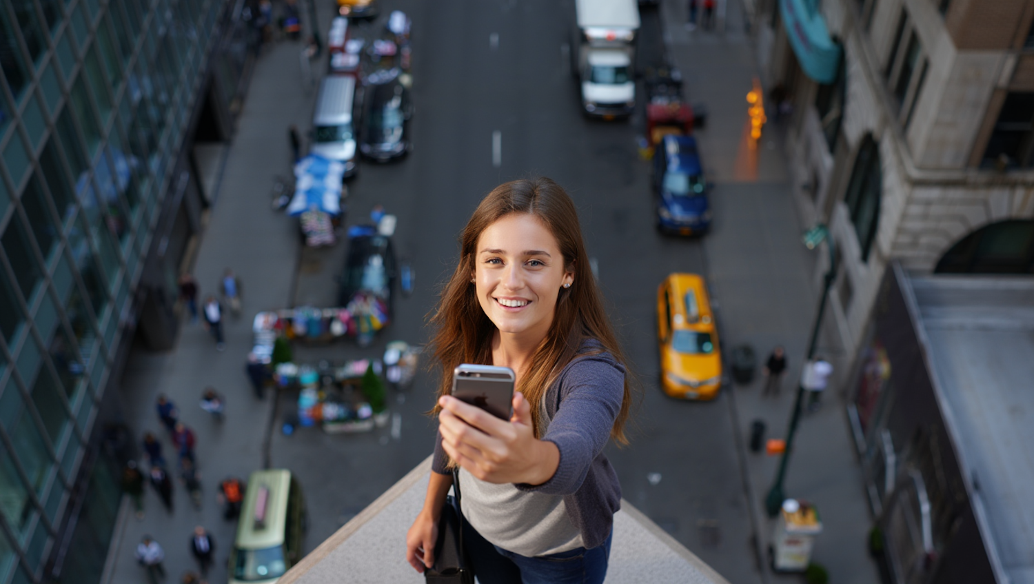 A young woman takes a selfie on a high ledge overlooking a busy city street with taxis, cars, and pedestrians below.