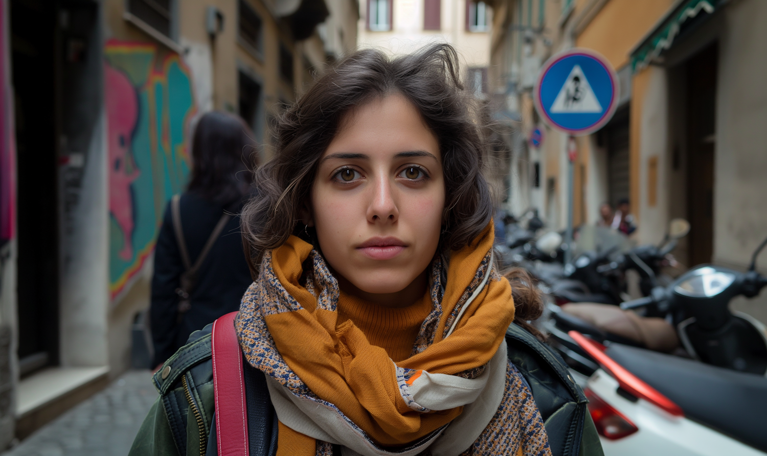 Young woman with brown eyes and wavy hair in a mustard scarf on a narrow street with scooters and urban art.