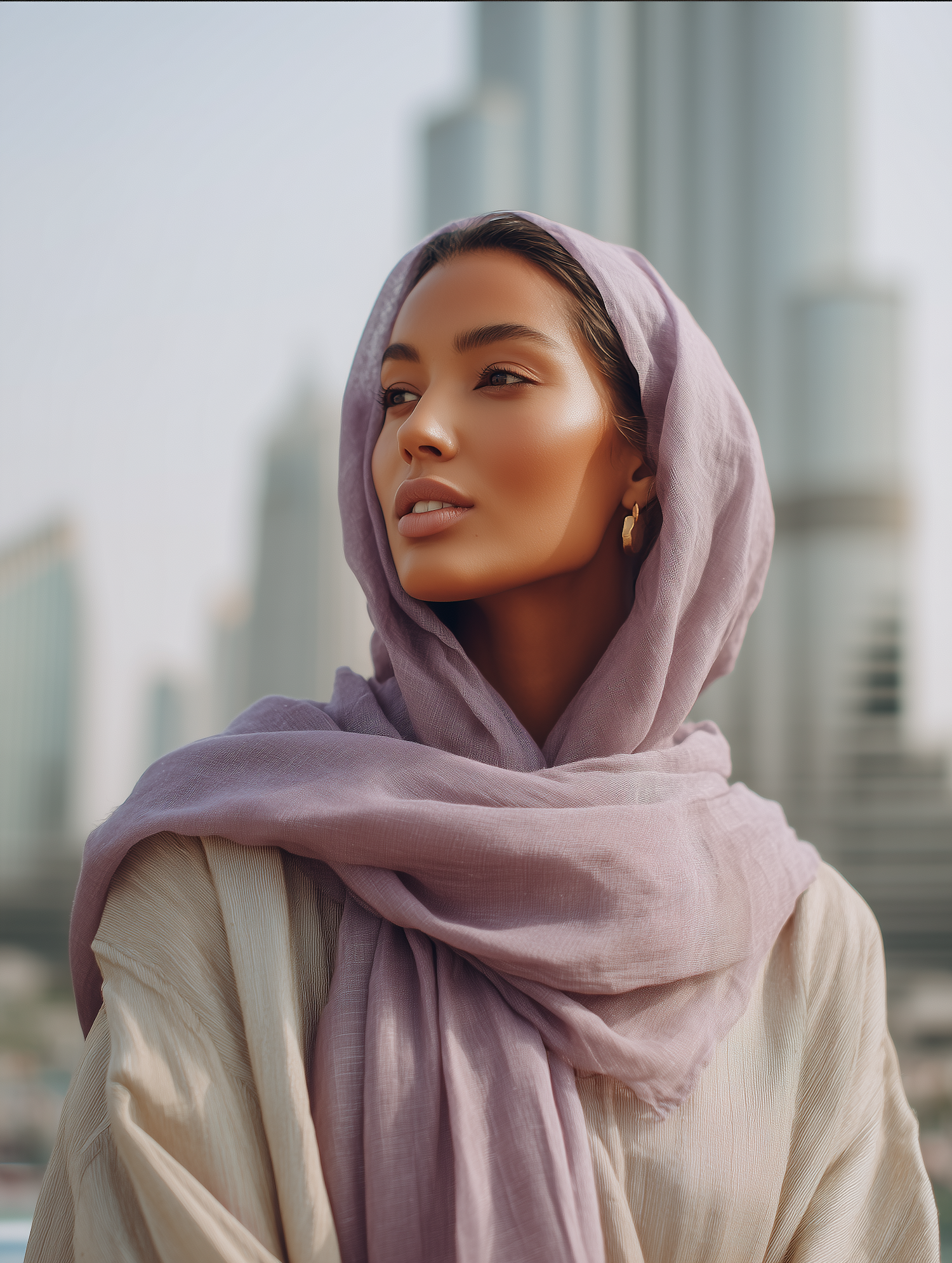 A serene portrait of a woman in a lavender headscarf with a modern cityscape in the background, exuding elegance and calm.