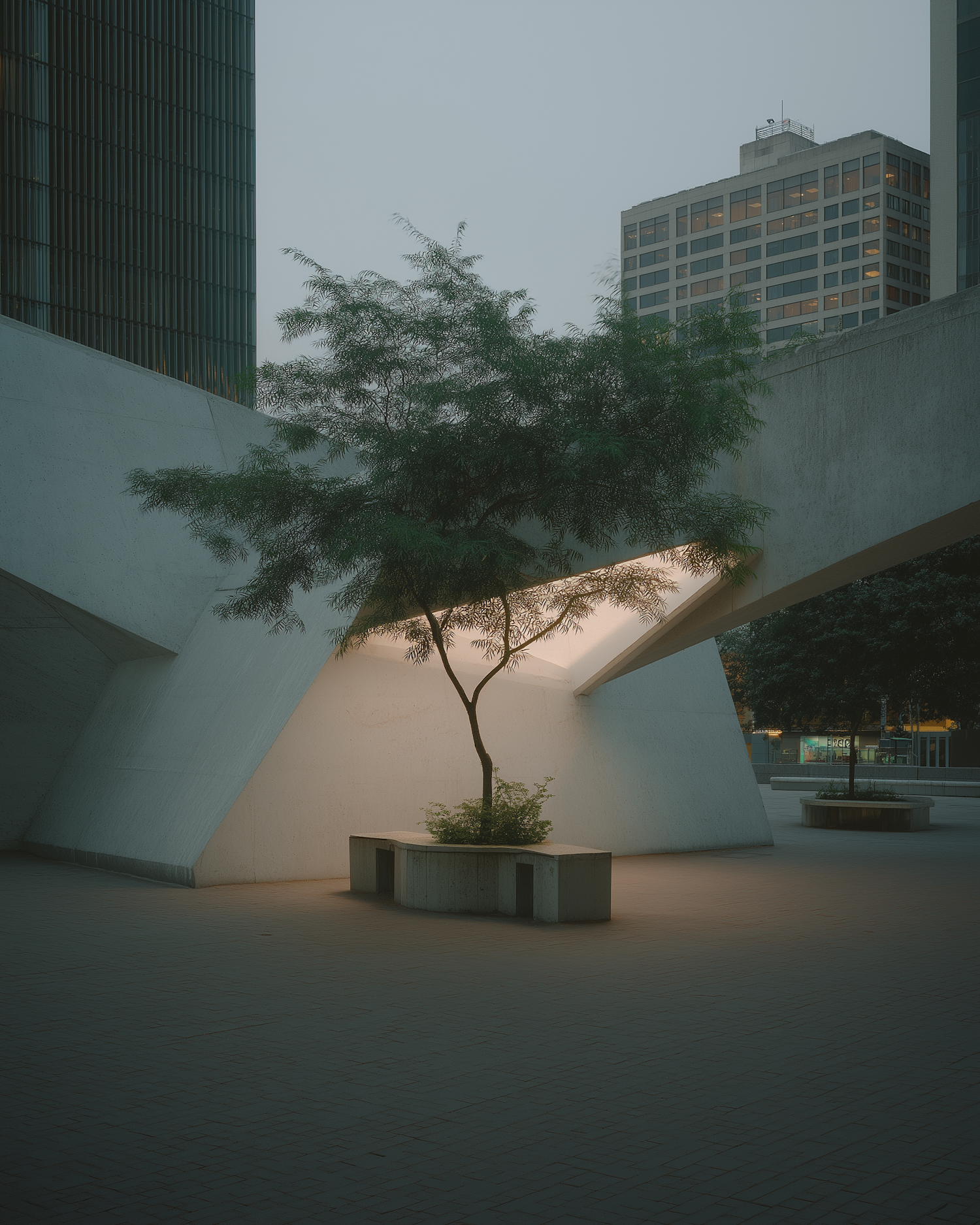 A tranquil urban setting with a tree in a concrete planter, softly lit under modern architecture, surrounded by tall buildings.
