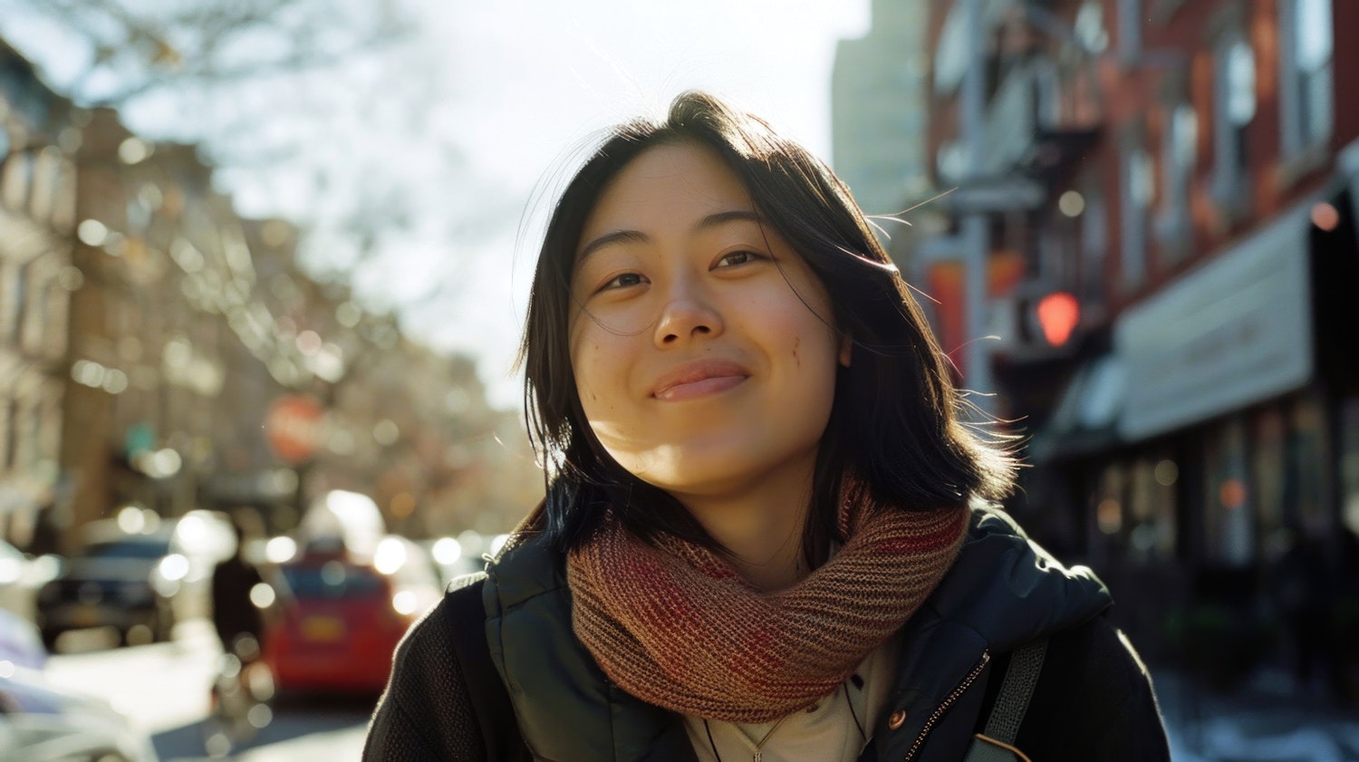 Young Asian woman smiling in a city street, wearing a dark jacket and scarf, with sunlight creating a warm glow.