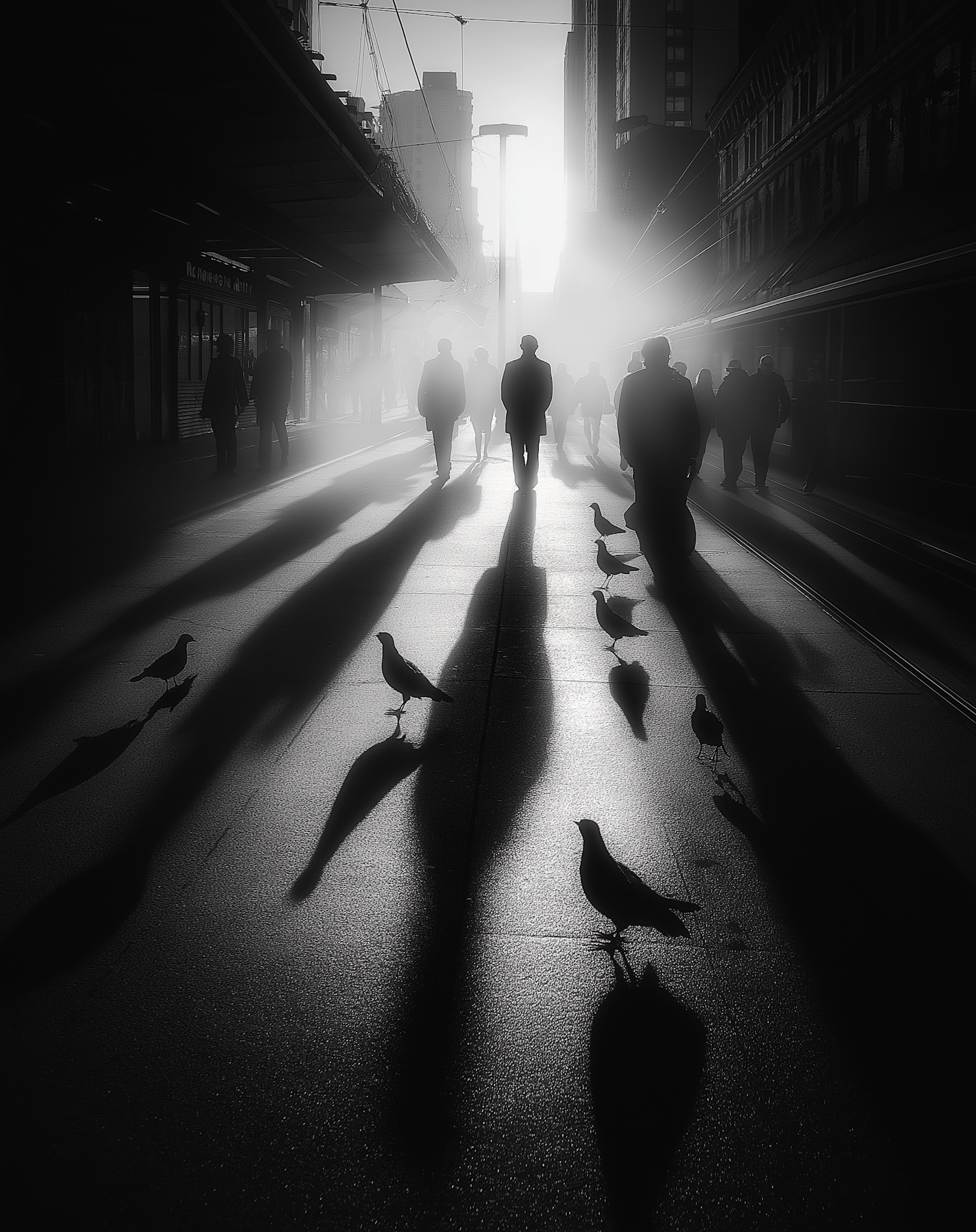 Silhouetted figures and pigeons create striking shadows on a sunlit urban street; a dramatic black-and-white photographic moment.