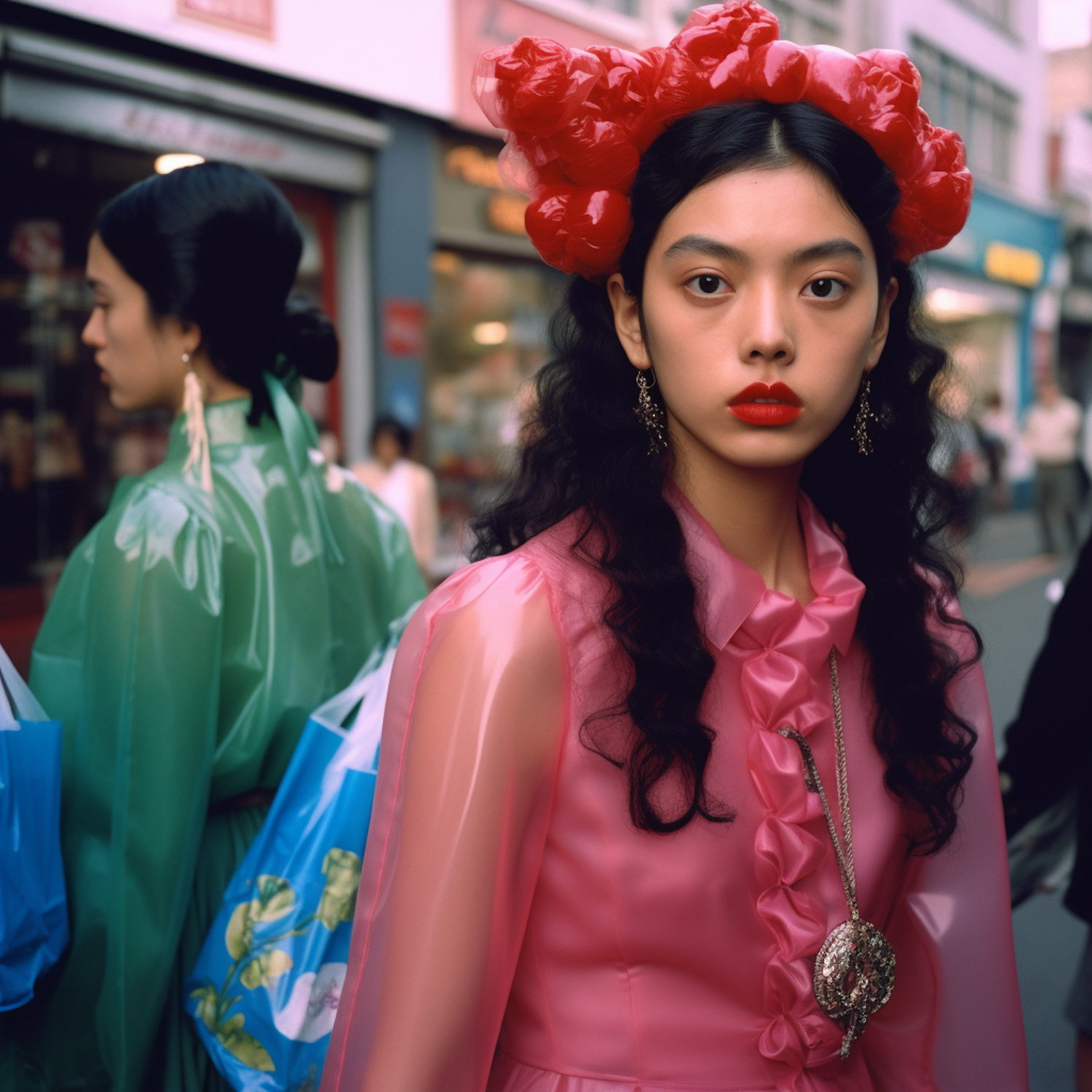 Two stylish women in vibrant translucent outfits and bold accessories in an urban setting, showcasing unique fashion and vivid colors.