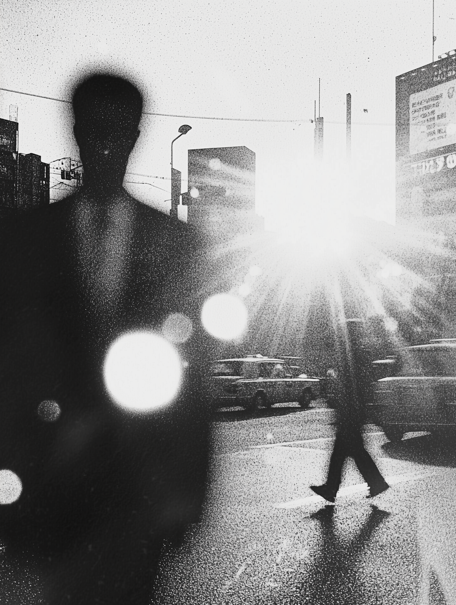 Grainy black and white city scene with silhouetted figures, bright sunlight, and lens flare creating a mysterious urban atmosphere.