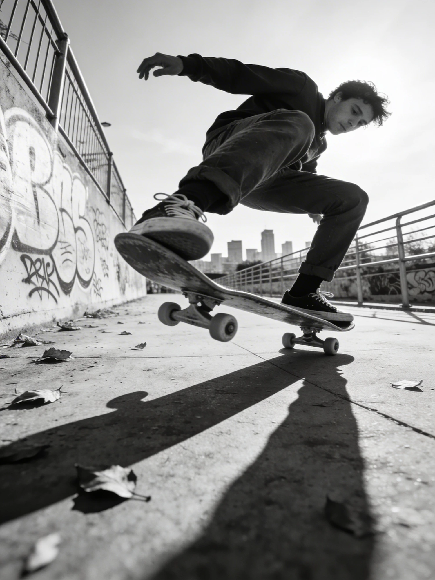 Dynamic black-and-white shot of a skateboarder mid-trick in an urban skate park, with graffiti walls and a city skyline in the background.