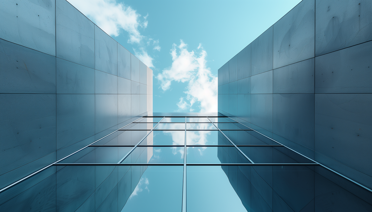 Modern architecture with reflective glass panels and a vibrant blue sky, creating a symmetrical and serene urban scene.