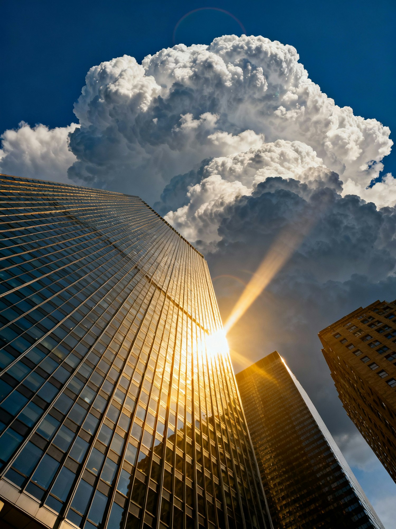 A dramatic cityscape with skyscrapers reflecting sunlight and a backdrop of billowing clouds under a vibrant blue sky.