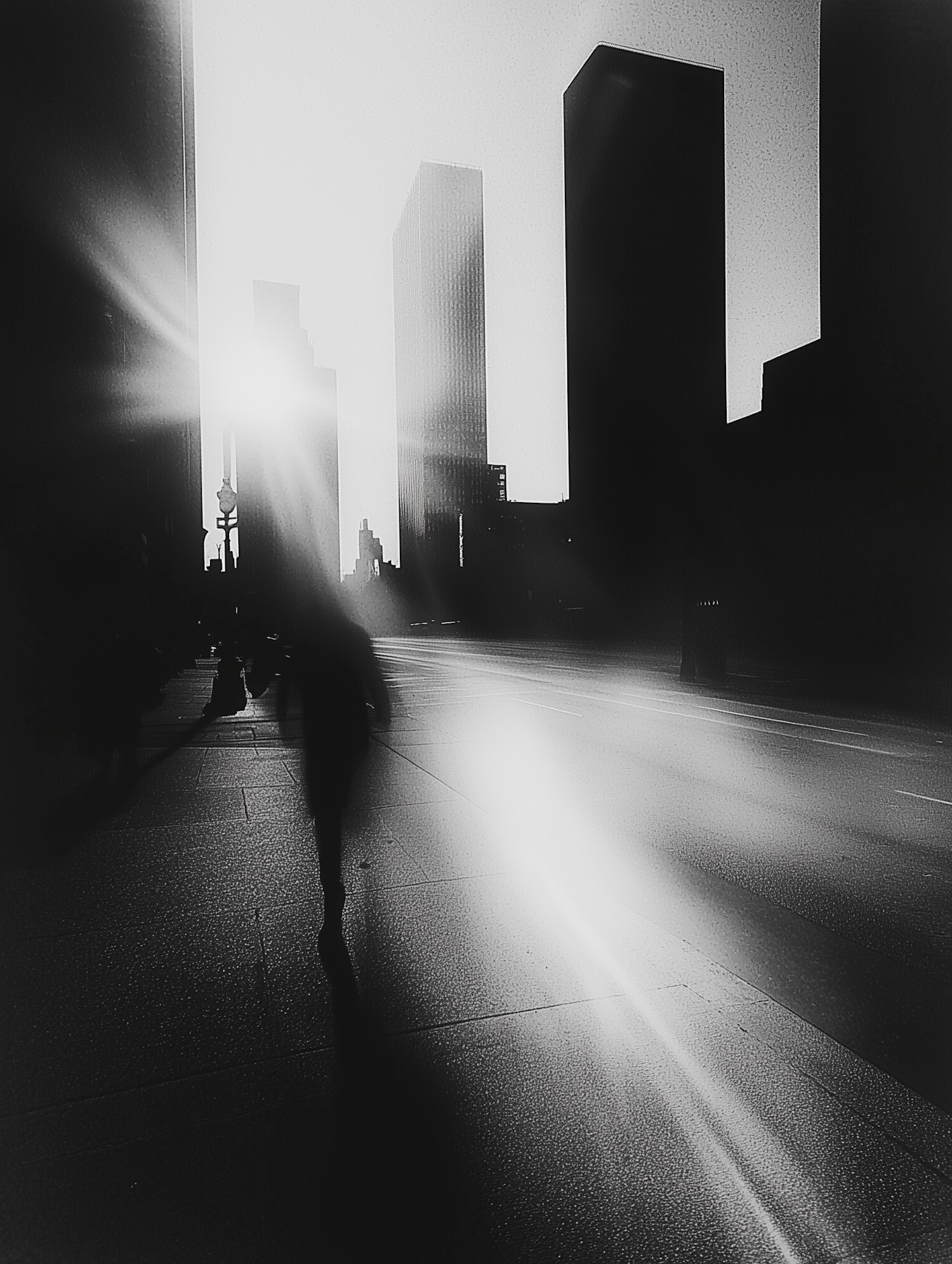 Black and white cityscape with silhouetted skyscrapers and a blurred figure walking, creating dramatic light and shadow contrasts.