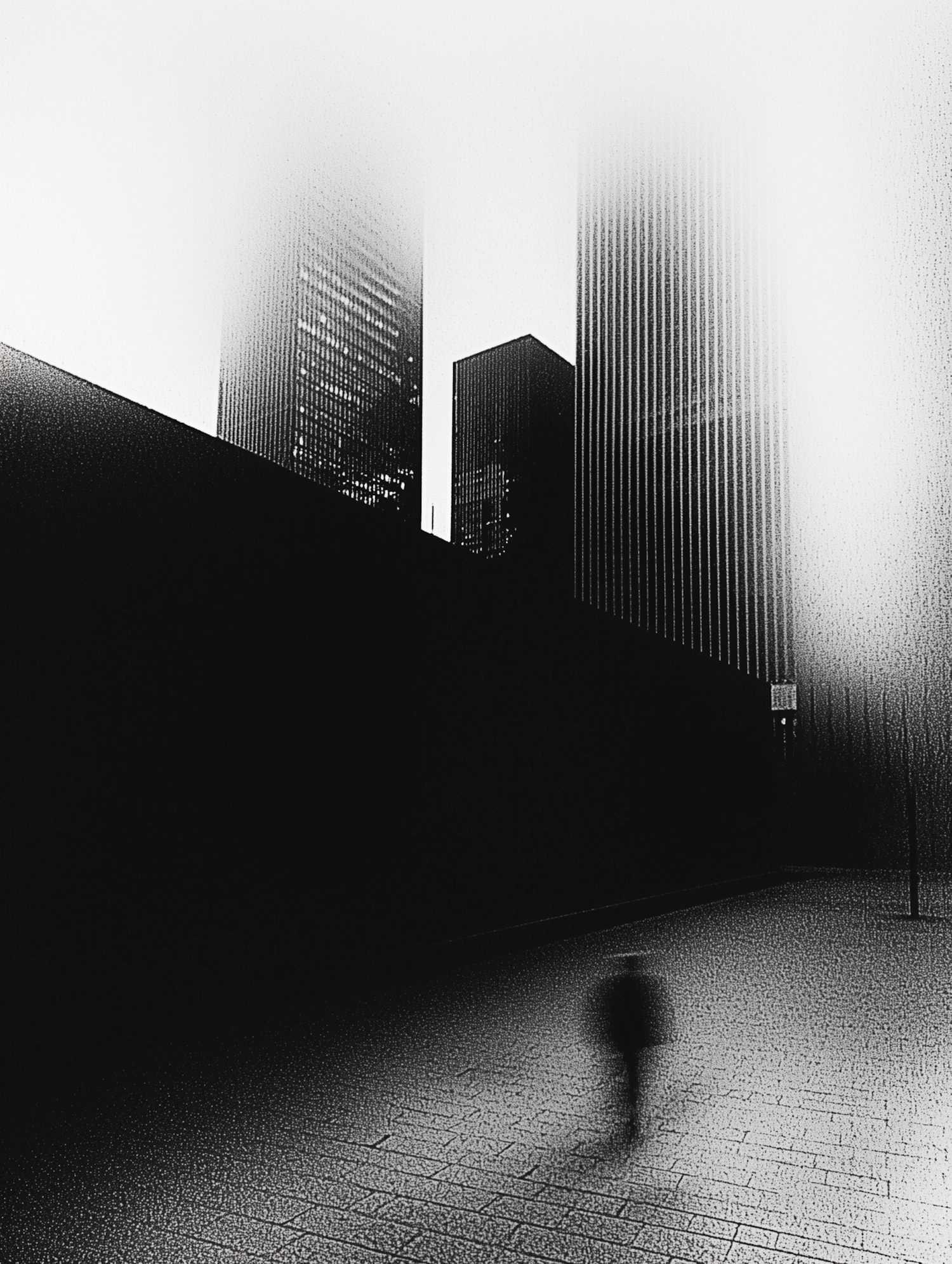 Monochrome cityscape with towering skyscrapers and a blurred silhouette on textured pavement, evoking urban solitude.