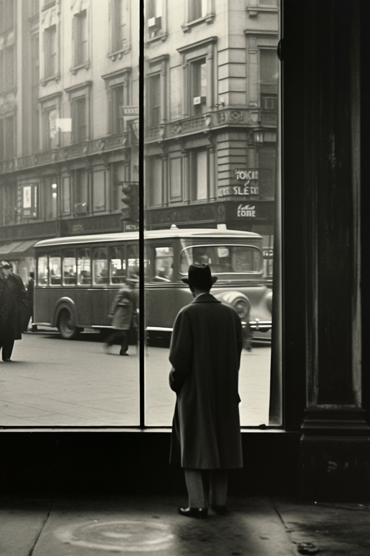 Black and white city scene with a man in an overcoat watching a vintage bus through a window. Classic architecture adds a nostalgic feel.