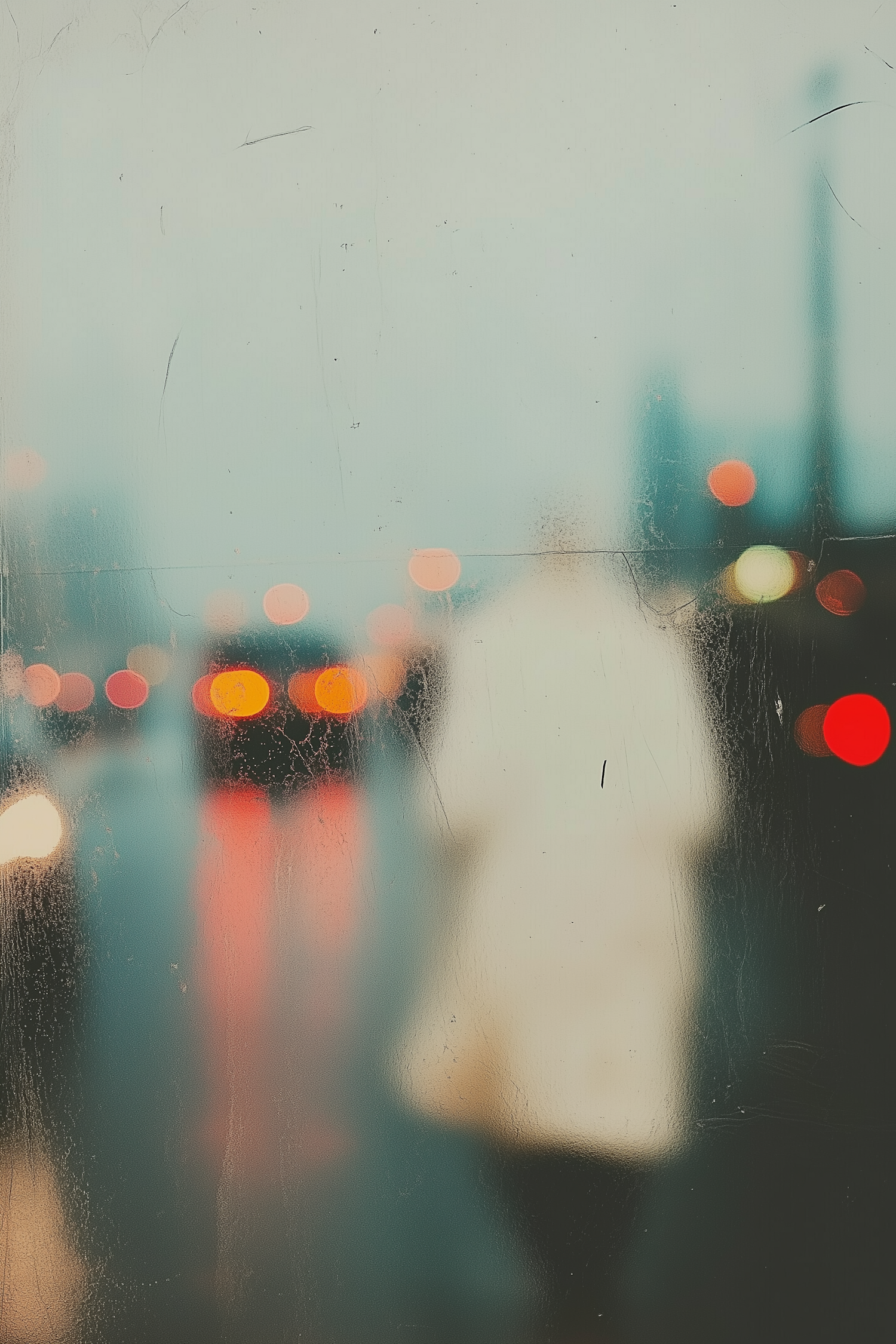 Blurred city street scene with bokeh lights and a figure in a white coat, viewed through a rain-speckled window.