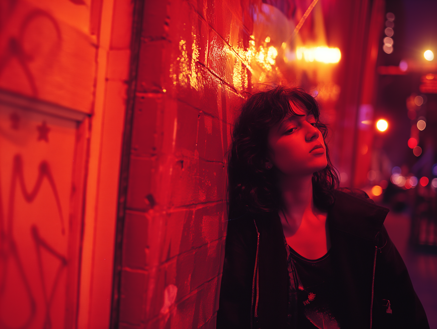 Young woman in red-lit urban scene, leaning against a graffiti wall at night, with a contemplative expression and city lights in the background.