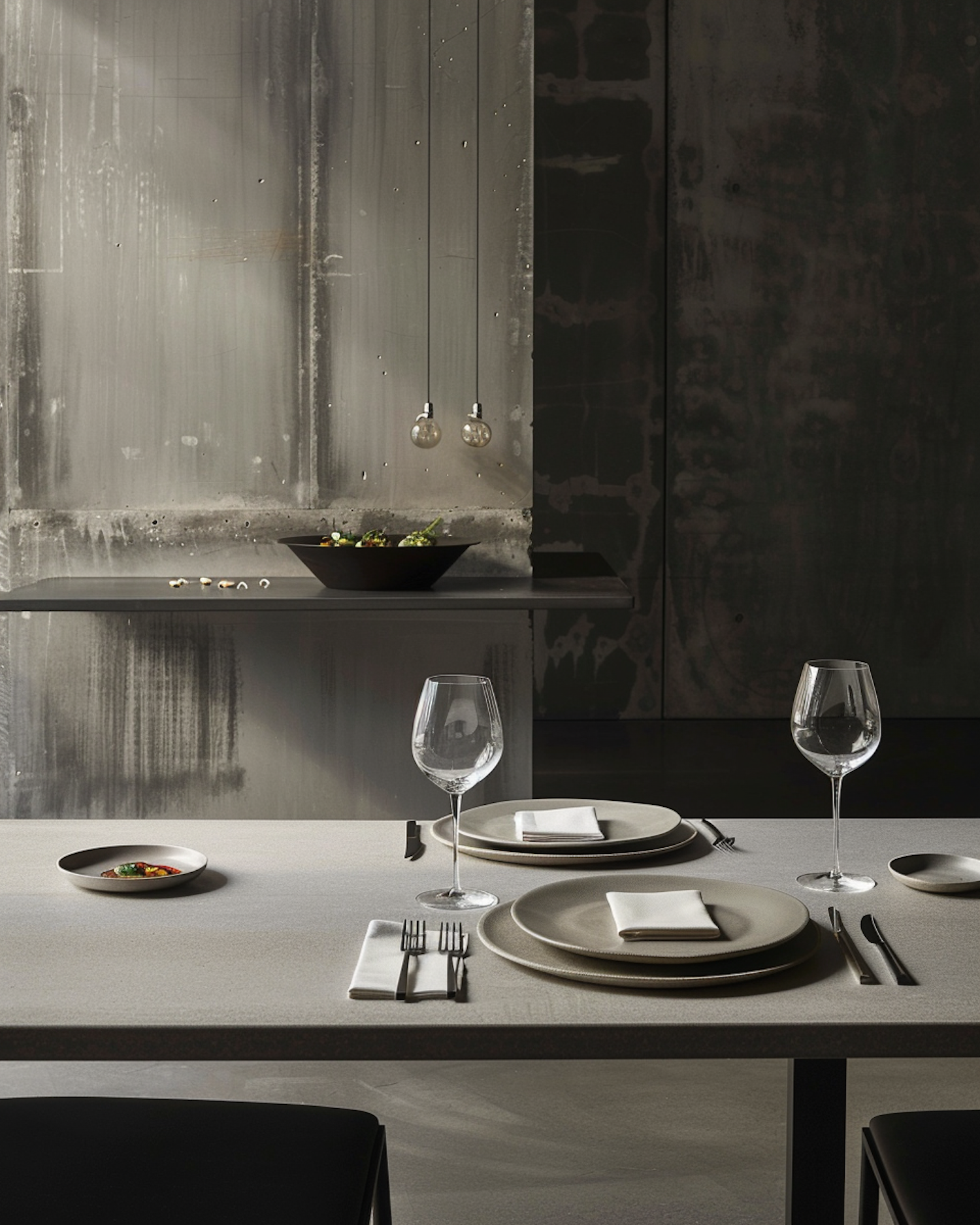 Minimalist dining setup with elegant tableware, wine glasses, and industrial-style background. Modern and sophisticated ambiance.