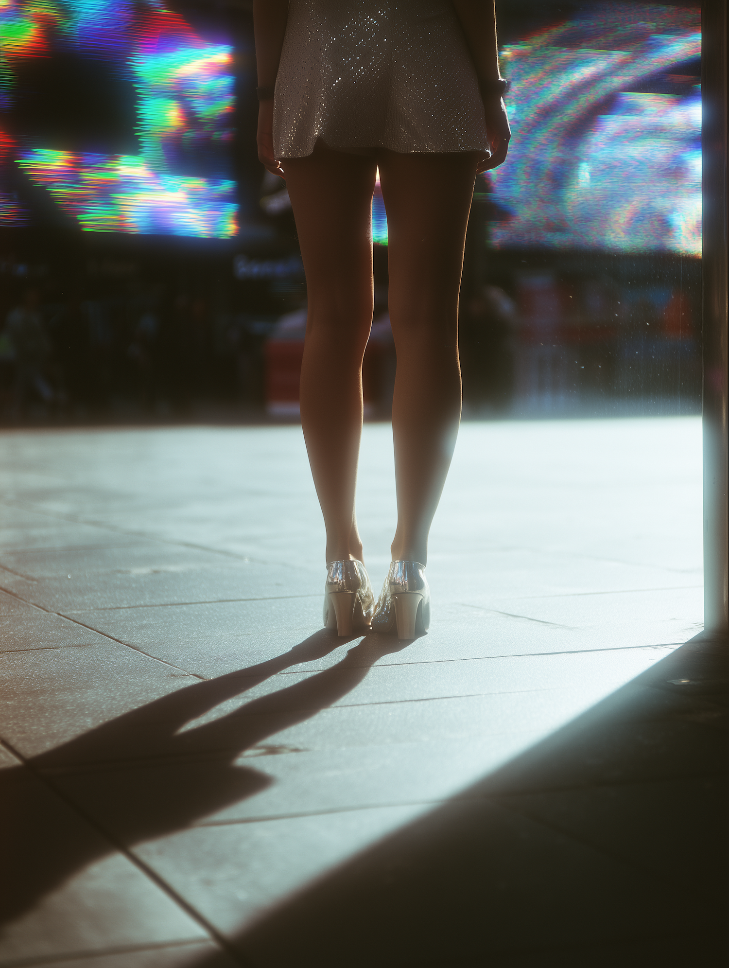 A person in a sparkly silver dress and transparent heels stands in a vibrant urban setting with colorful lights and dramatic shadows.