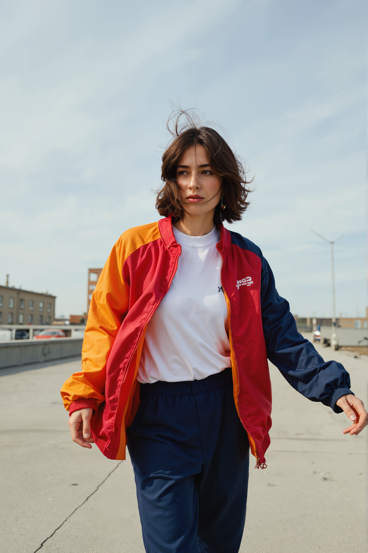 Stylish woman in a colorful jacket and sporty outfit standing outdoors on a sunny day with an urban backdrop.