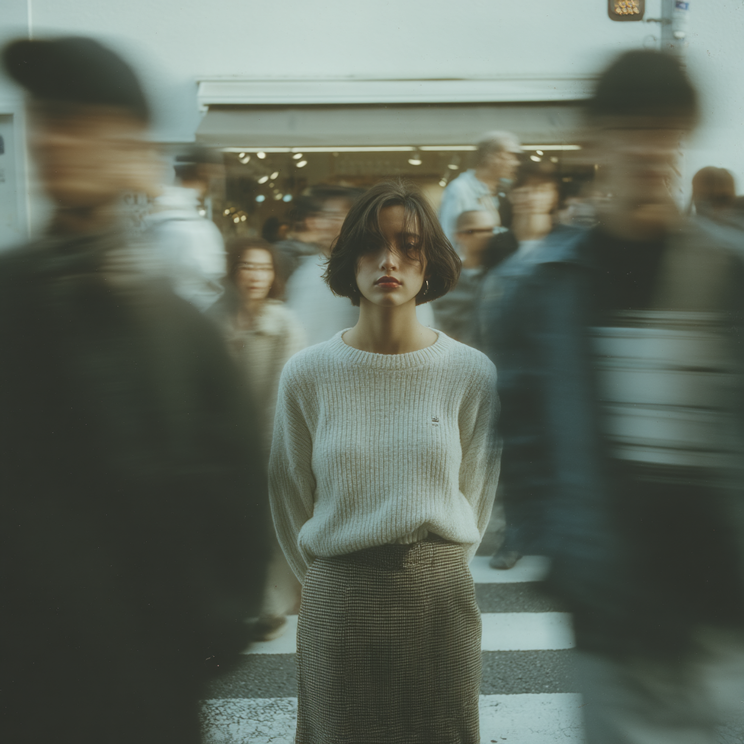 A young woman stands still in a busy urban scene, her calm presence contrasting with the blurred motion of the crowd around her.