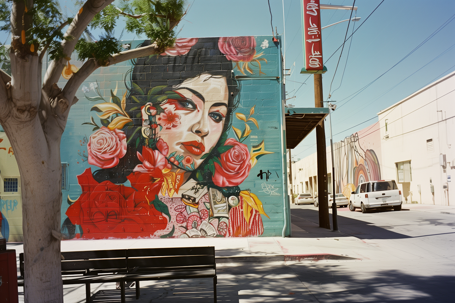 Colorful mural of a woman's face with flowers on a city wall, blending vibrant reds, pinks, and greens in an urban street setting.