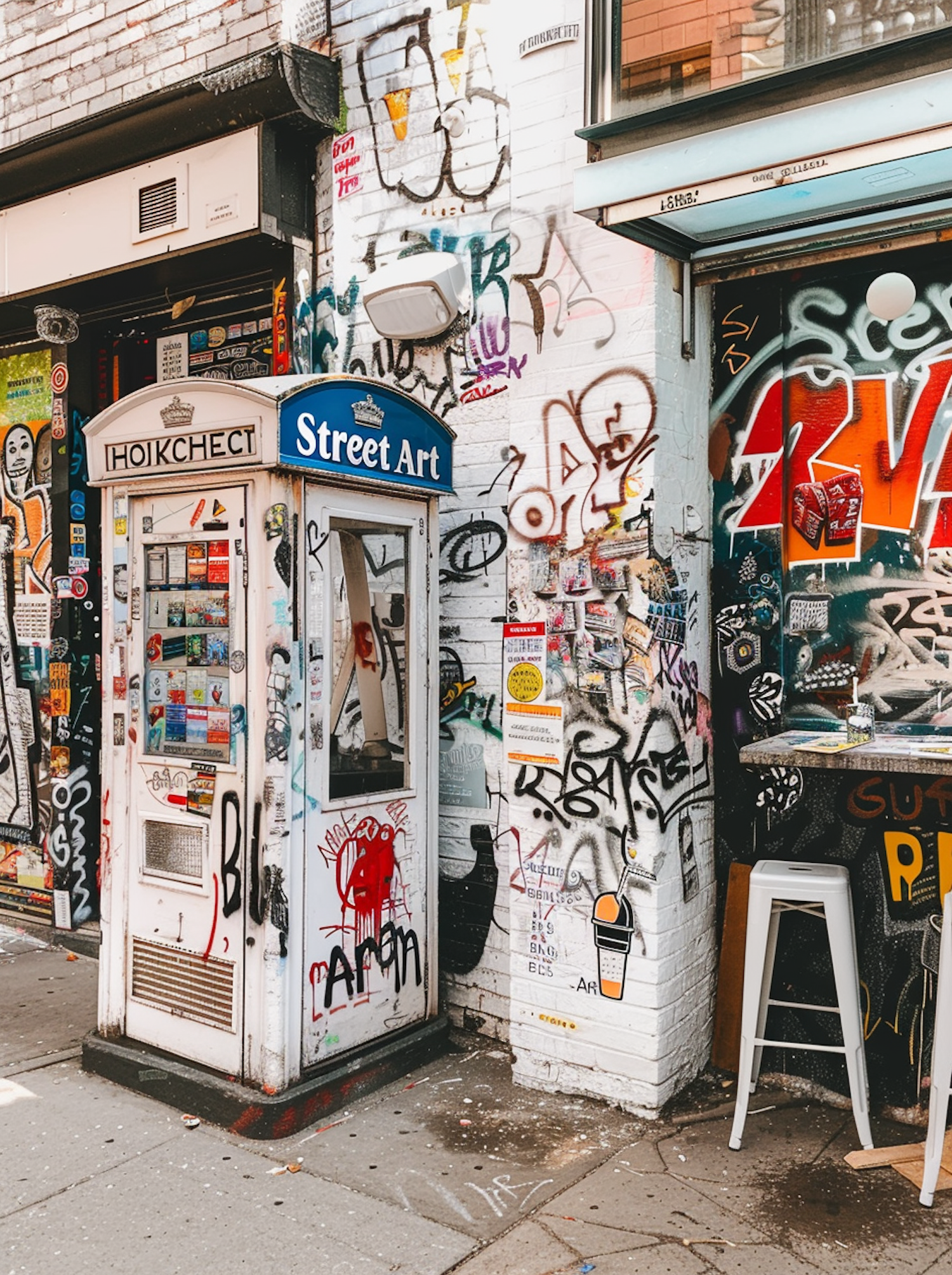 Vibrant urban scene with graffiti-covered walls and a phone booth labeled 'Street Art,' showcasing street culture and creativity.