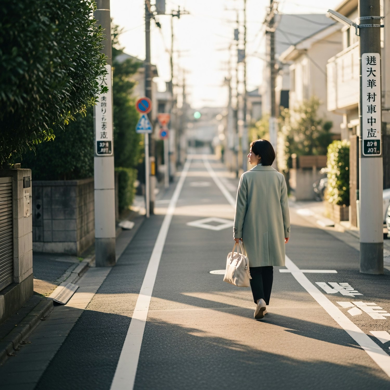 A person in a light coat walks down a peaceful Japanese street, carrying a white bag. The sunny day highlights the quiet urban surroundings.
